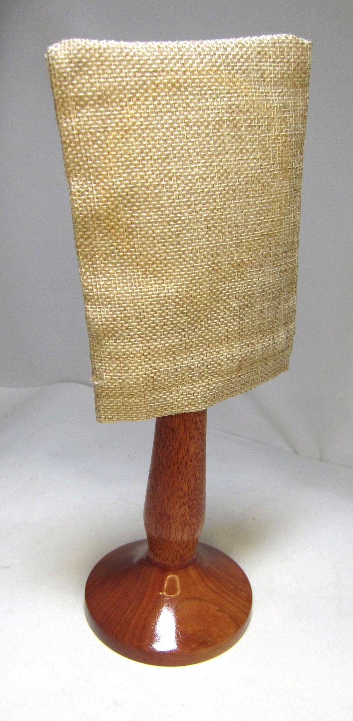 This one measures about 10” tall. The woods are mahogany and cherry. The glass itself is a very high quality optical. It is 3” around to the outside and the glass itself is 2 5/8” diameter. It comes with a burlap cover that is not only to protect the glass when not in use but is also for safety. You don’t want to put this on a desk or table that receives direct sunlight because you could start a fire if the focused beam finds something flammable. This cover will prevent that.