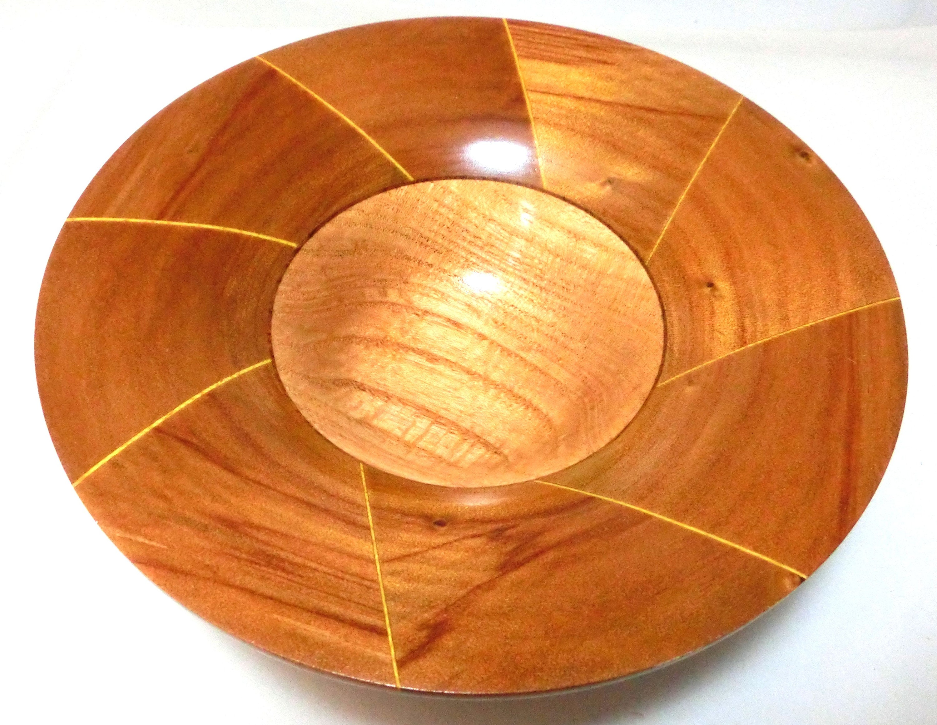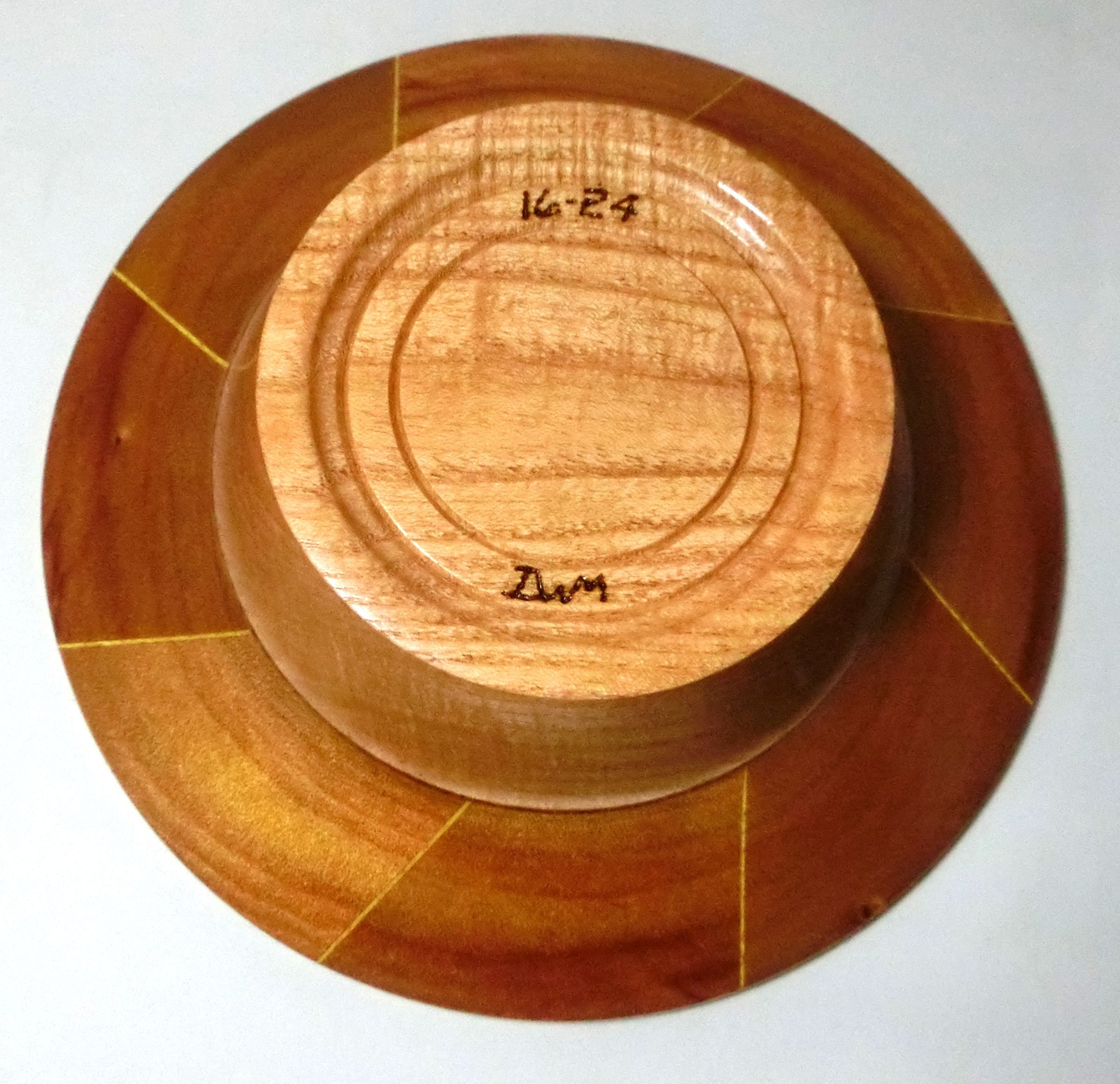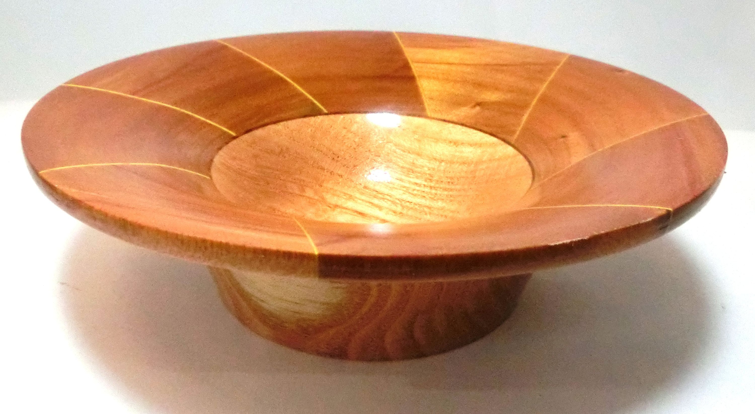 This bowl made of Honey Locust and Andiroba woods. The ring of Andiroba is segmented in a turbine wheel design with yellow veneer between the segments. It is 7 inches in diameter and about 2 inches tall. It has a gloss finish and is signed and numbered.