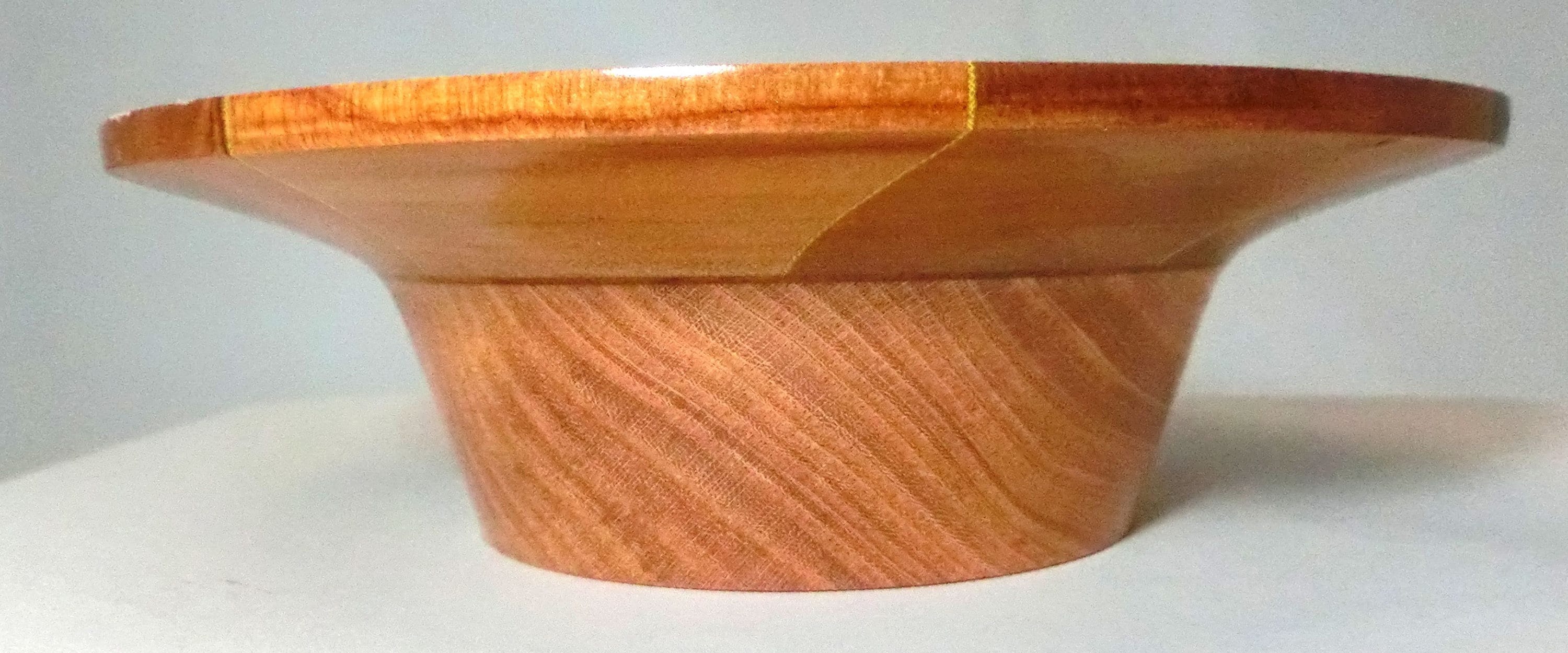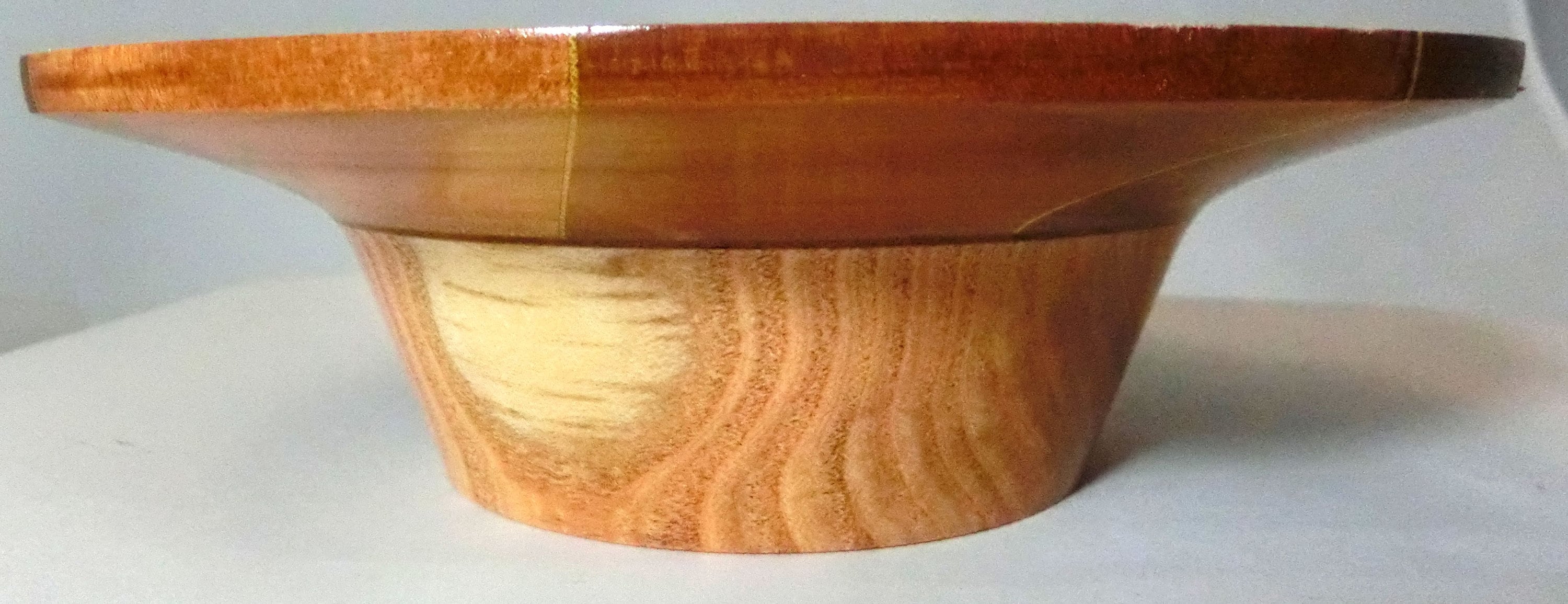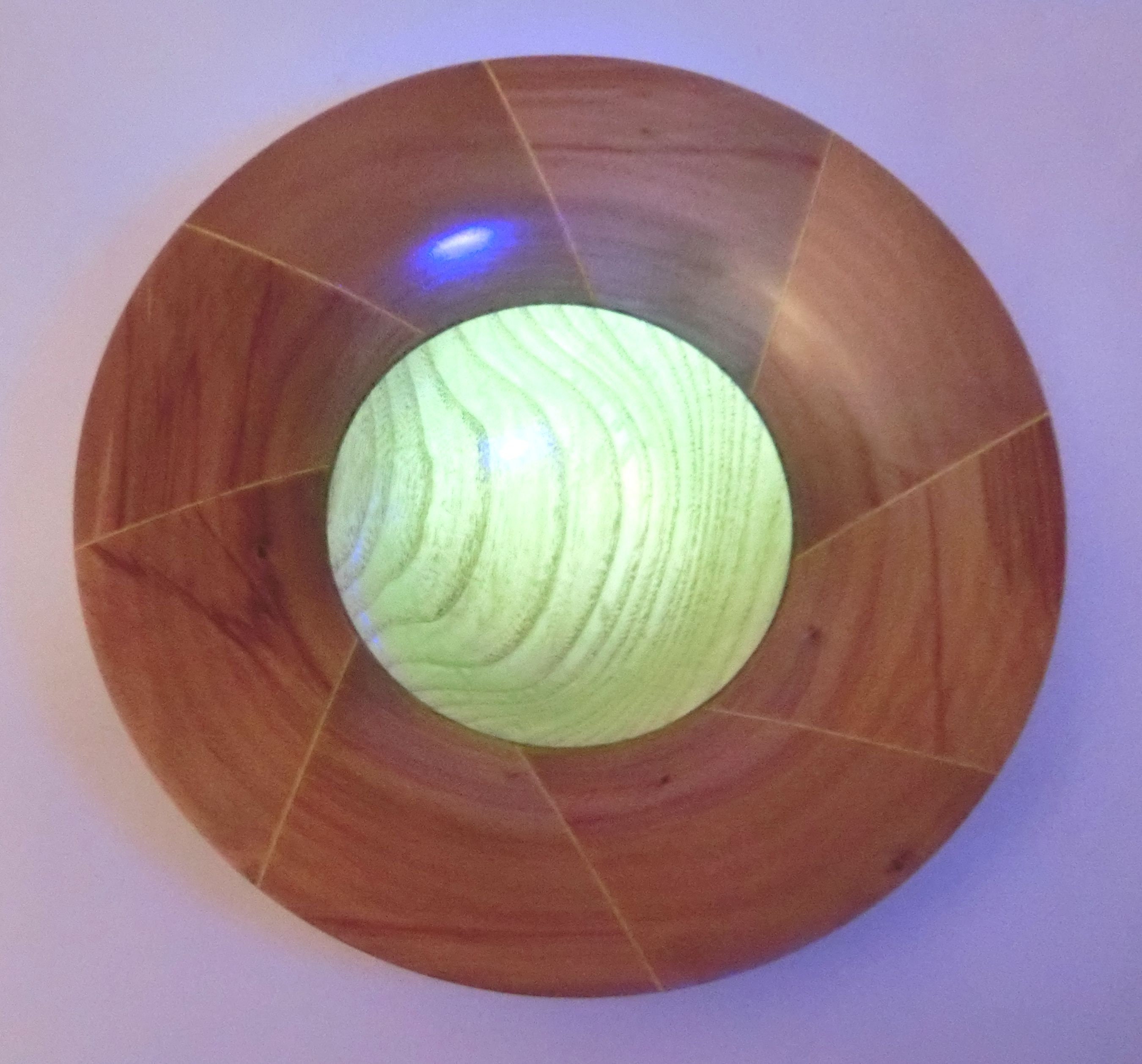 This bowl made of Honey Locust and Andiroba woods. The ring of Andiroba is segmented in a turbine wheel design with yellow veneer between the segments. It is 7 inches in diameter and about 2 inches tall. It has a gloss finish and is signed and numbered.