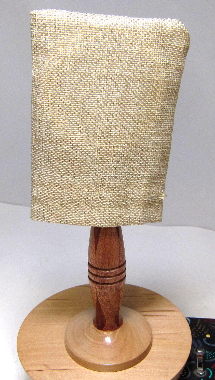 The body is made of turned segmented wood. It is about 10 inches tall and the base is about 2 ¾ inches. The glass itself is a very high-quality optical glass with a solid brass frame. It is 3” around to the outside and the glass itself is 2 5/8” diameter. It comes with a burlap cover that is not only to protect the glass when not in use but is also for safety. You don’t want to put this on a desk or table that receives direct sunlight because you could start a fire if the focused beam finds something flammable. This cover will prevent that.