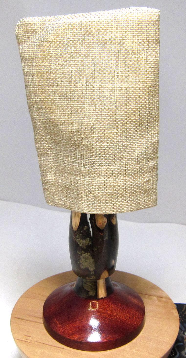 The body is made of maple twigs set in resin. It is about 10 inches tall and the base is about 3 3/8 inches. The glass itself is a very high-quality optical glass with a solid brass frame. It is 3” around to the outside and the glass itself is 2 5/8” diameter. It comes with a burlap cover that is not only to protect the glass when not in use but is also for safety. You don’t want to put this on a desk or table that receives direct sunlight because you could start a fire if the focused beam finds something flammable. This cover will prevent that.