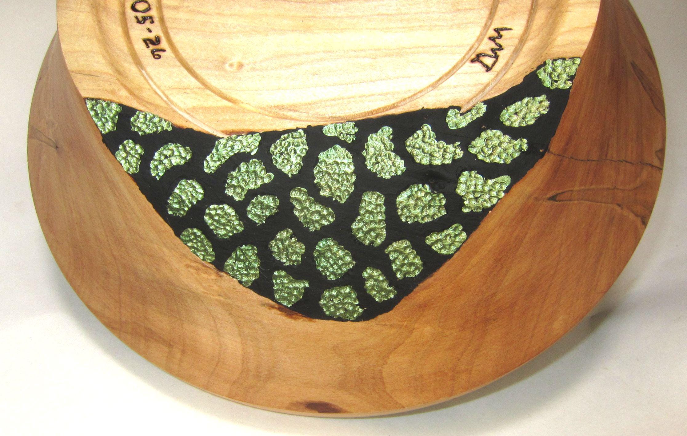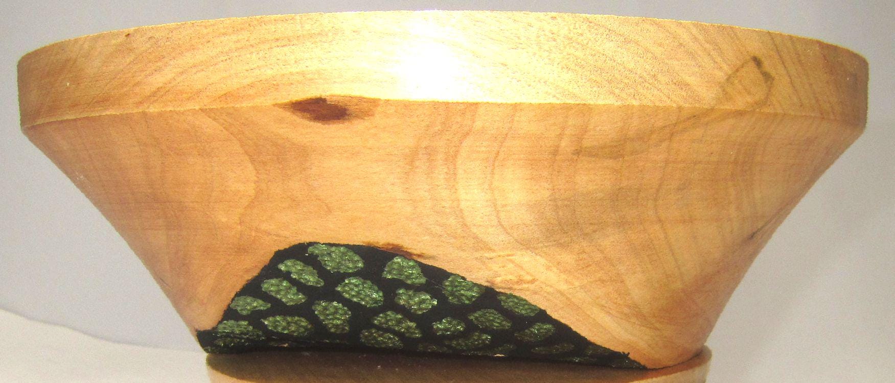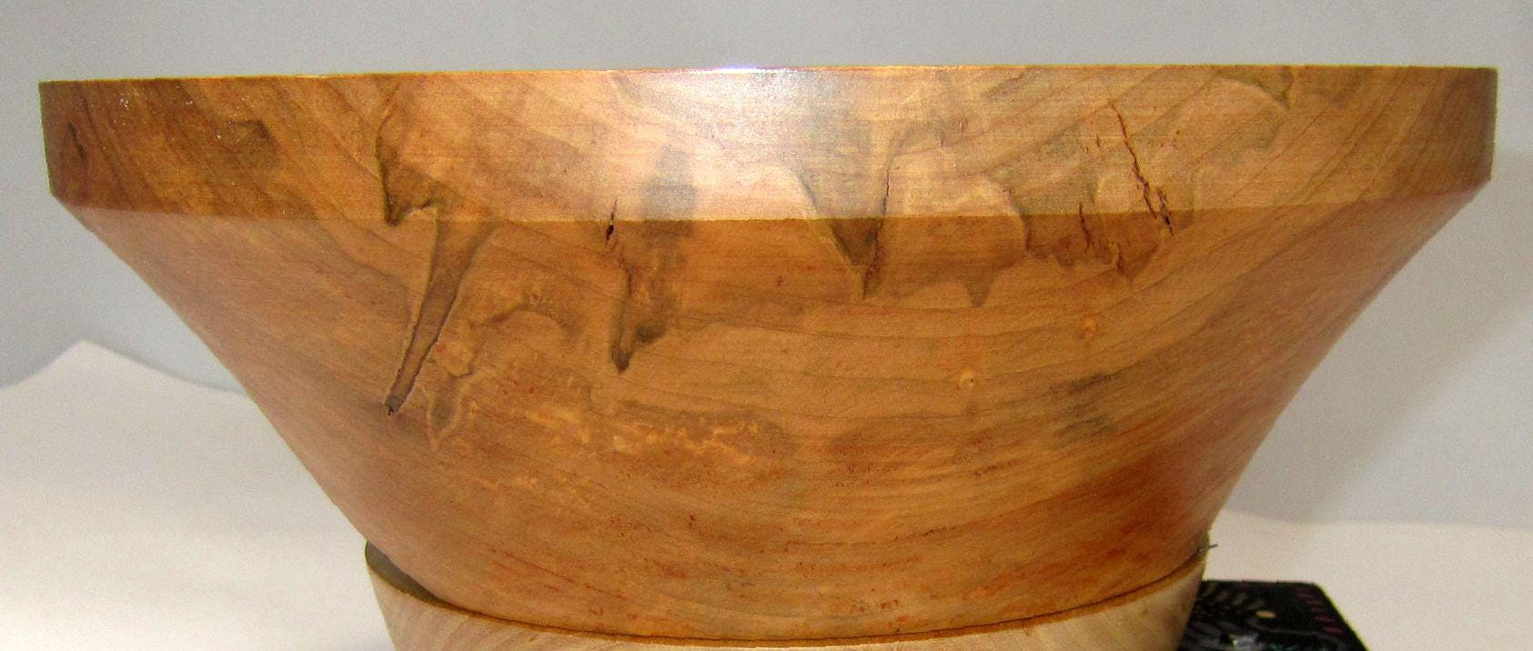 This bowl is made of Ambrosia Maple and measures about 8 ¾ inches in diameter and is about 2 ½ inches high. This piece of wood came from a log and had an odd shape. This required a bit of compromise in order to make a bowl out of it. Therefore, some sections of the outside were textured and colored after turning to give it a unique character. You can see that in the photos. It has a gloss finish on the inside and stained semi-gloss finish on the outside. I’ll let the photos and video speak for themselves.