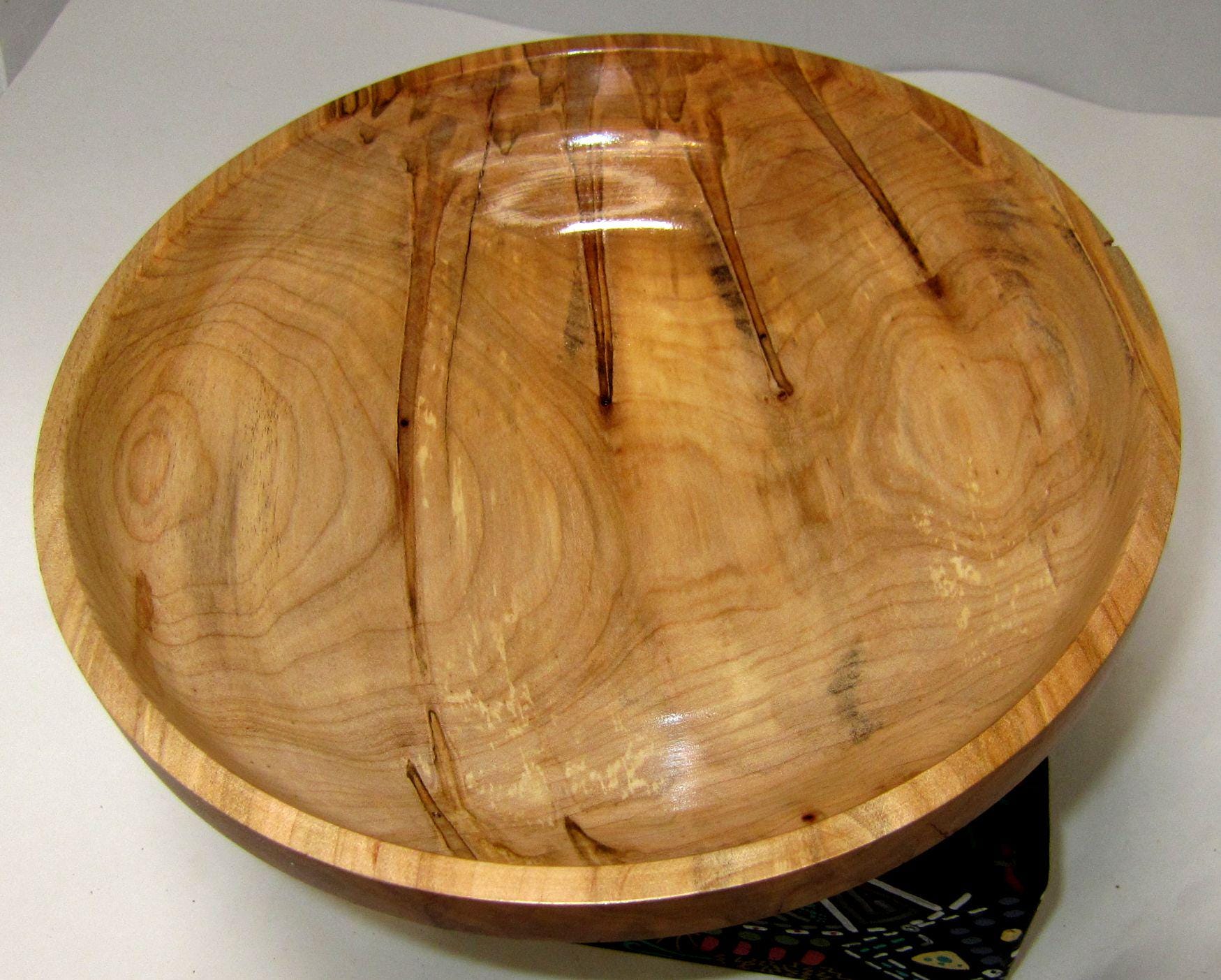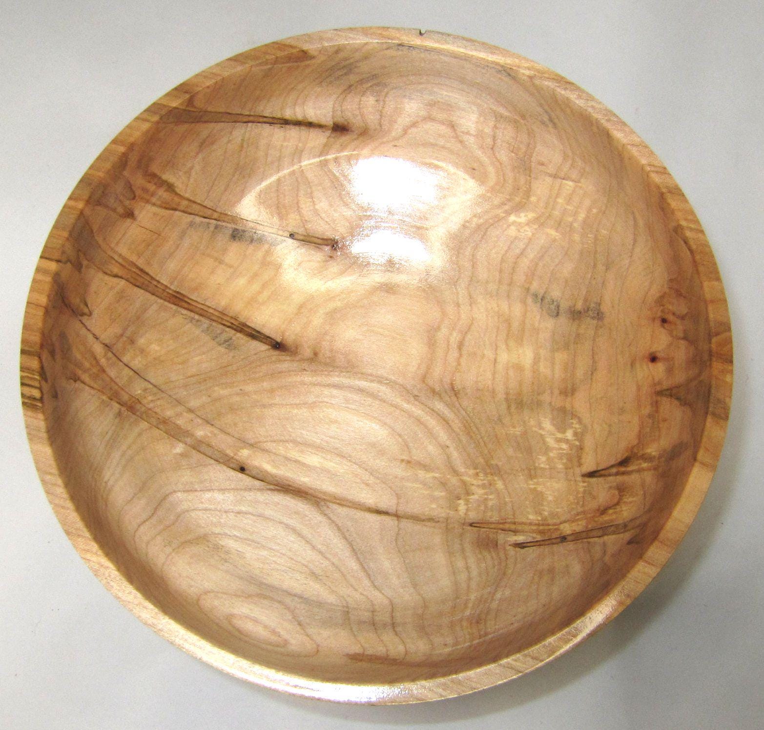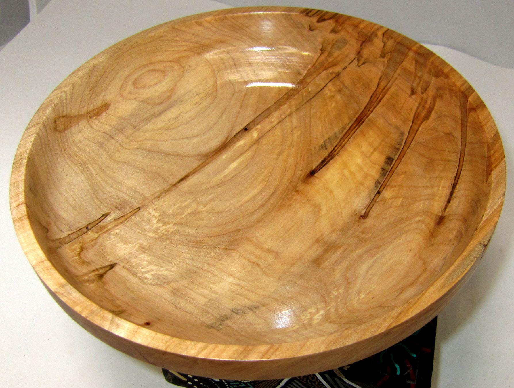 This bowl is made of Ambrosia Maple and measures about 8 ¾ inches in diameter and is about 2 ½ inches high. This piece of wood came from a log and had an odd shape. This required a bit of compromise in order to make a bowl out of it. Therefore, some sections of the outside were textured and colored after turning to give it a unique character. You can see that in the photos. It has a gloss finish on the inside and stained semi-gloss finish on the outside. I’ll let the photos and video speak for themselves.
