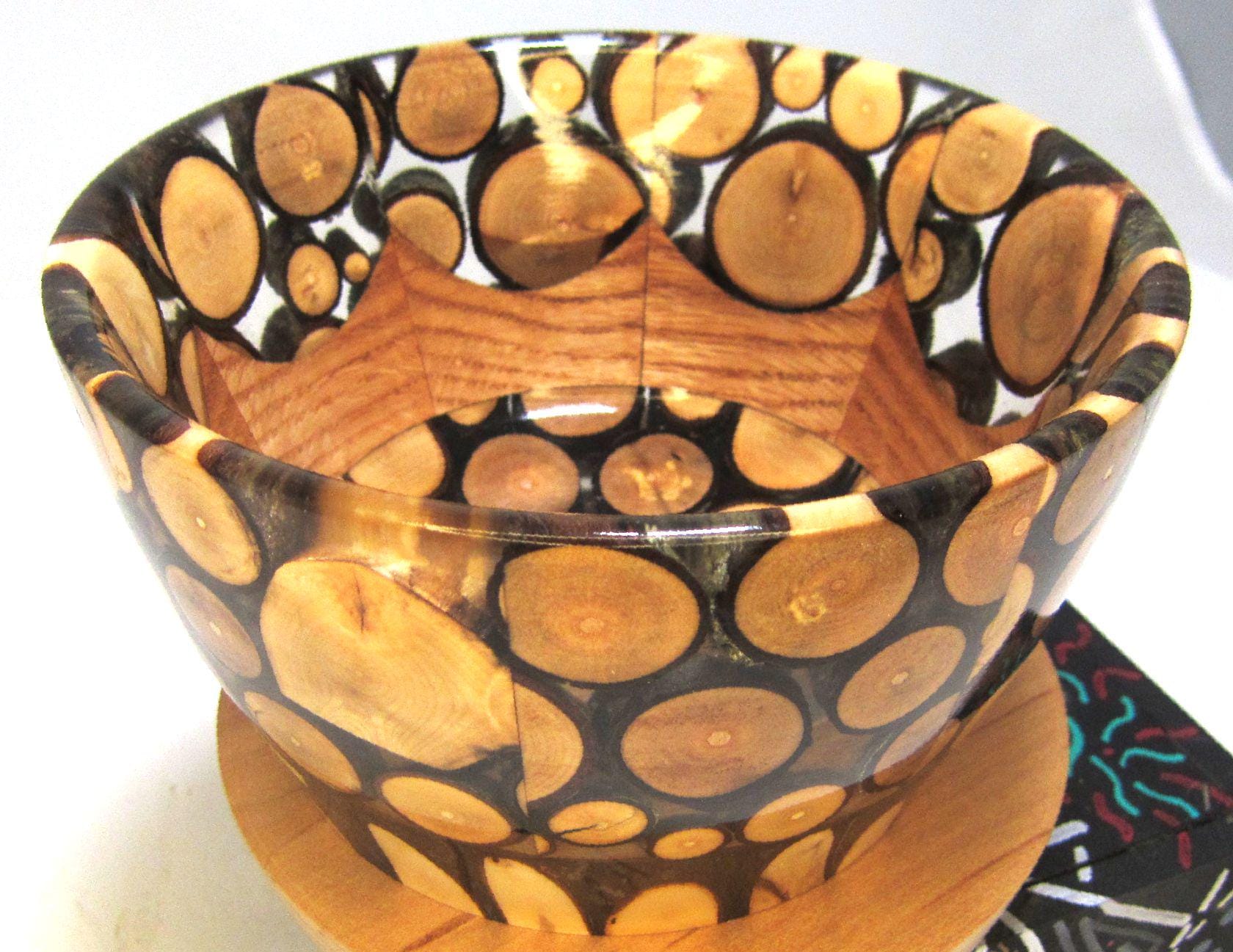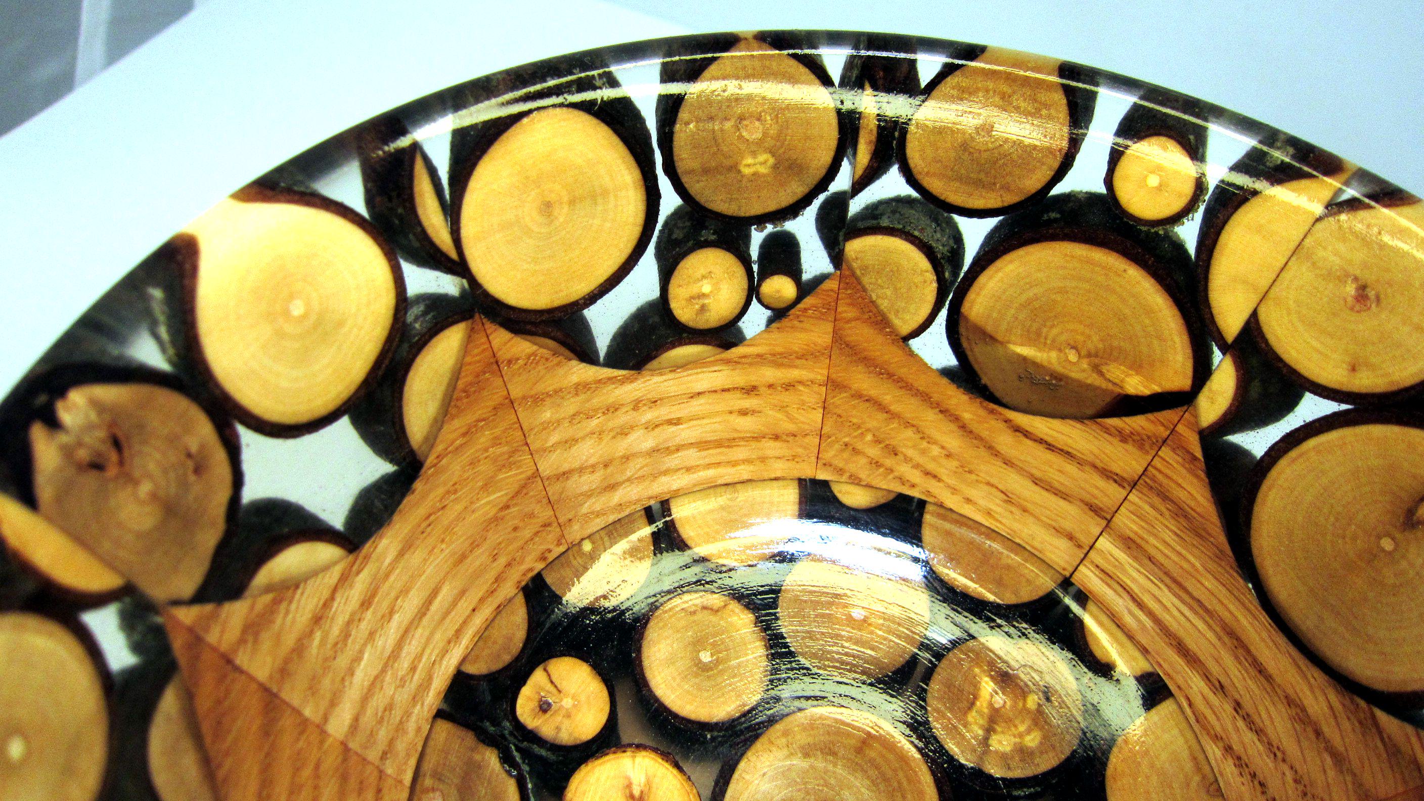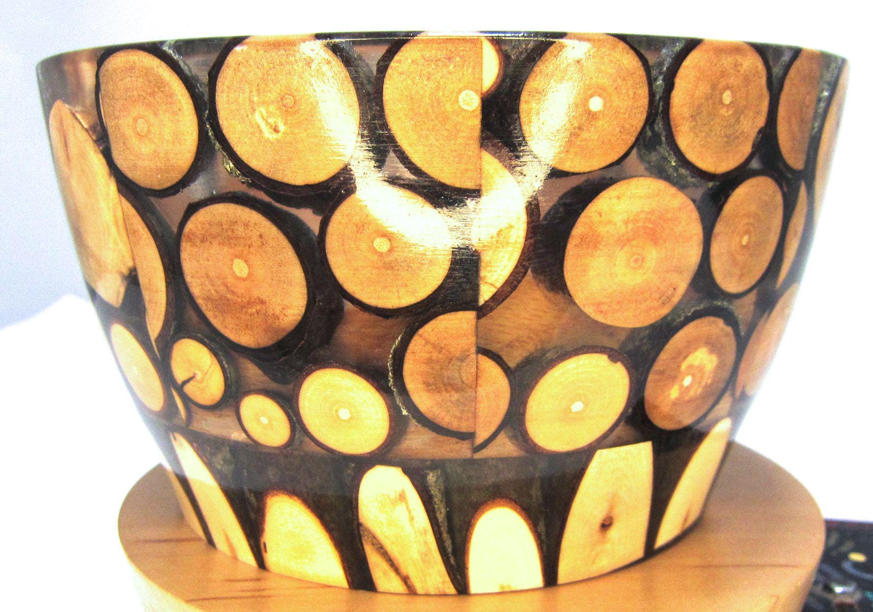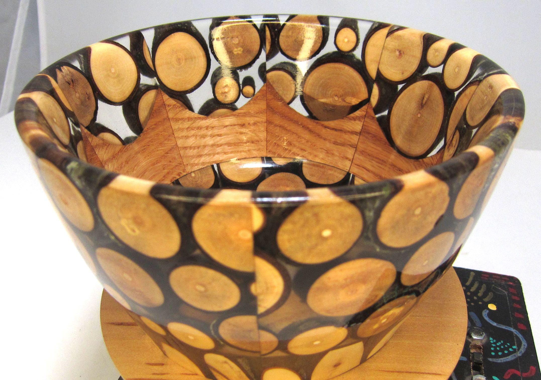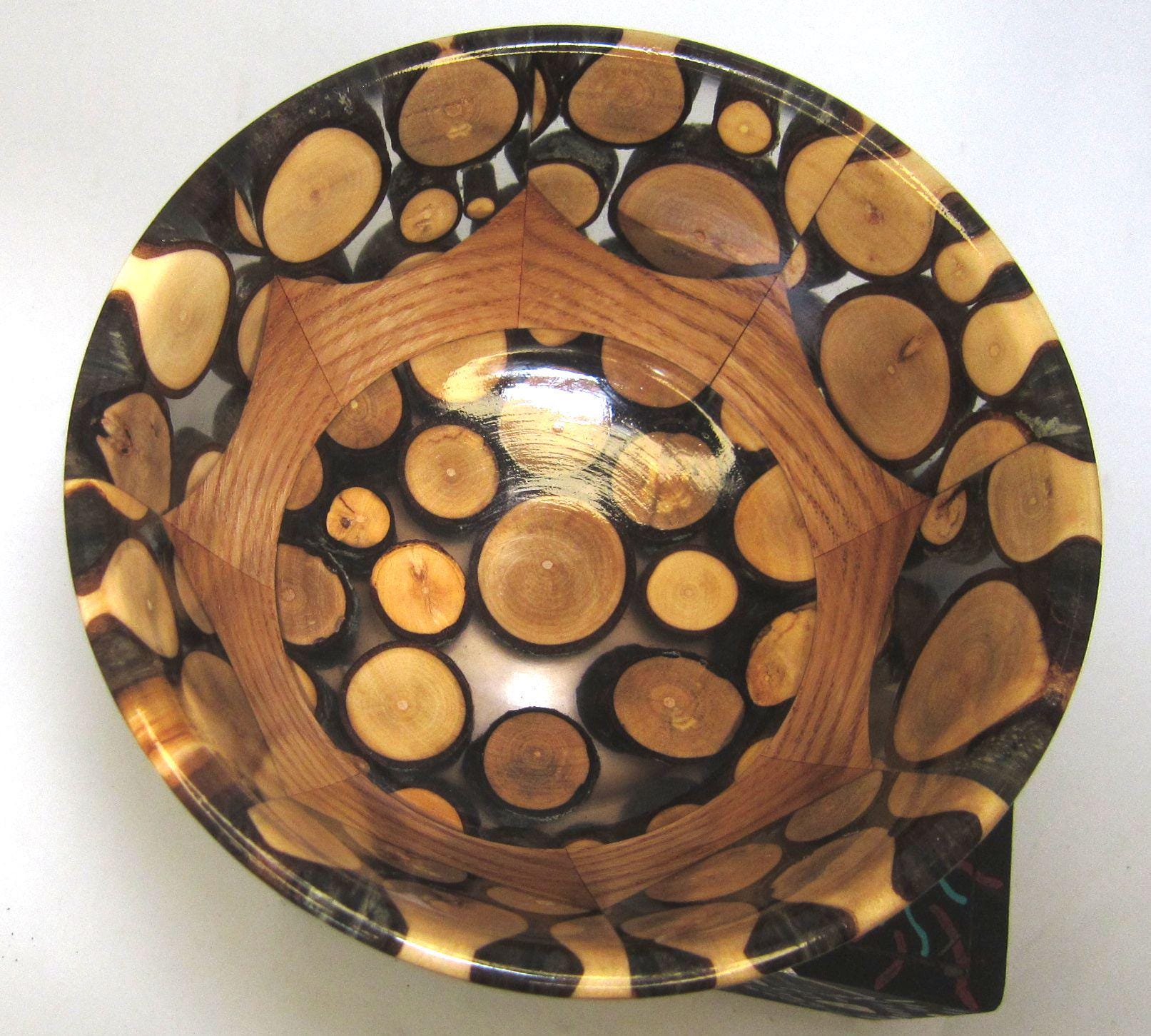 This bowl is made of Oak with Maple twigs and epoxy. It measures about 6 inches in diameter and is about 3 3/8 inches high. The maple twigs came from the trees in my yard and the name derives from the fact that the wind blew the branches down. It has a gloss finish. I’ll let the photos and video speak for themselves.