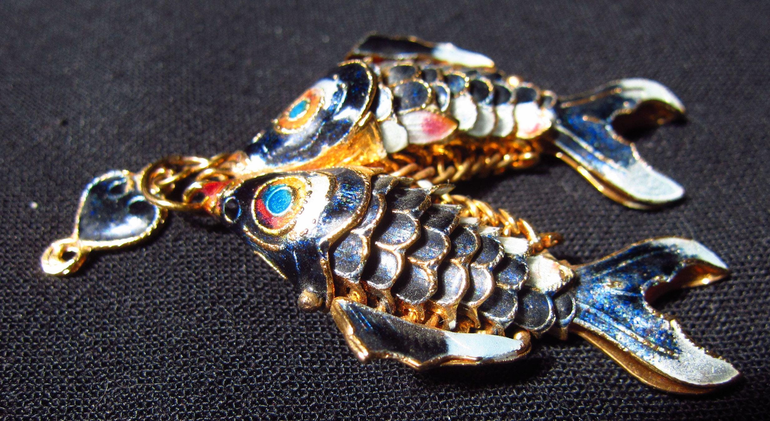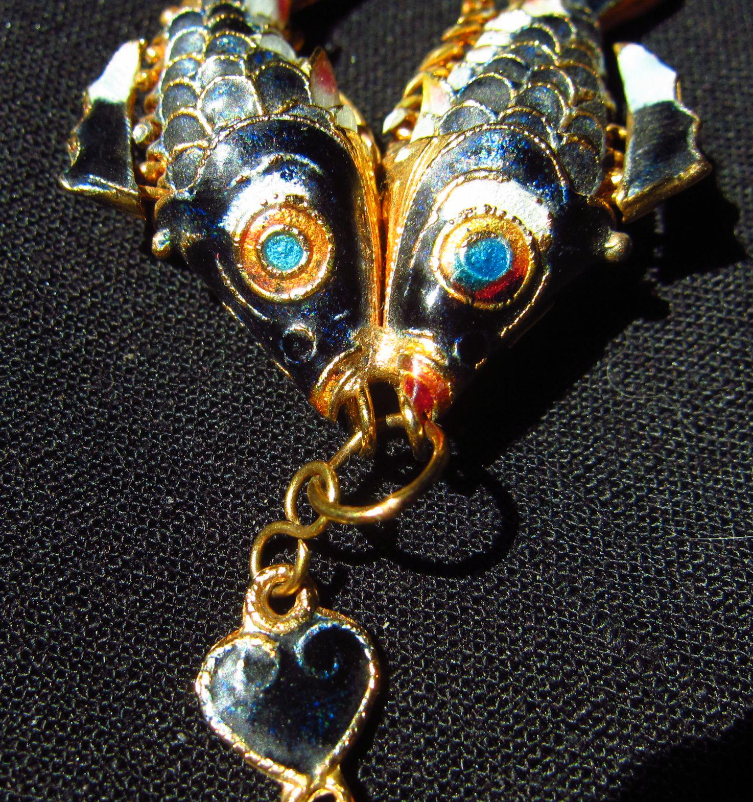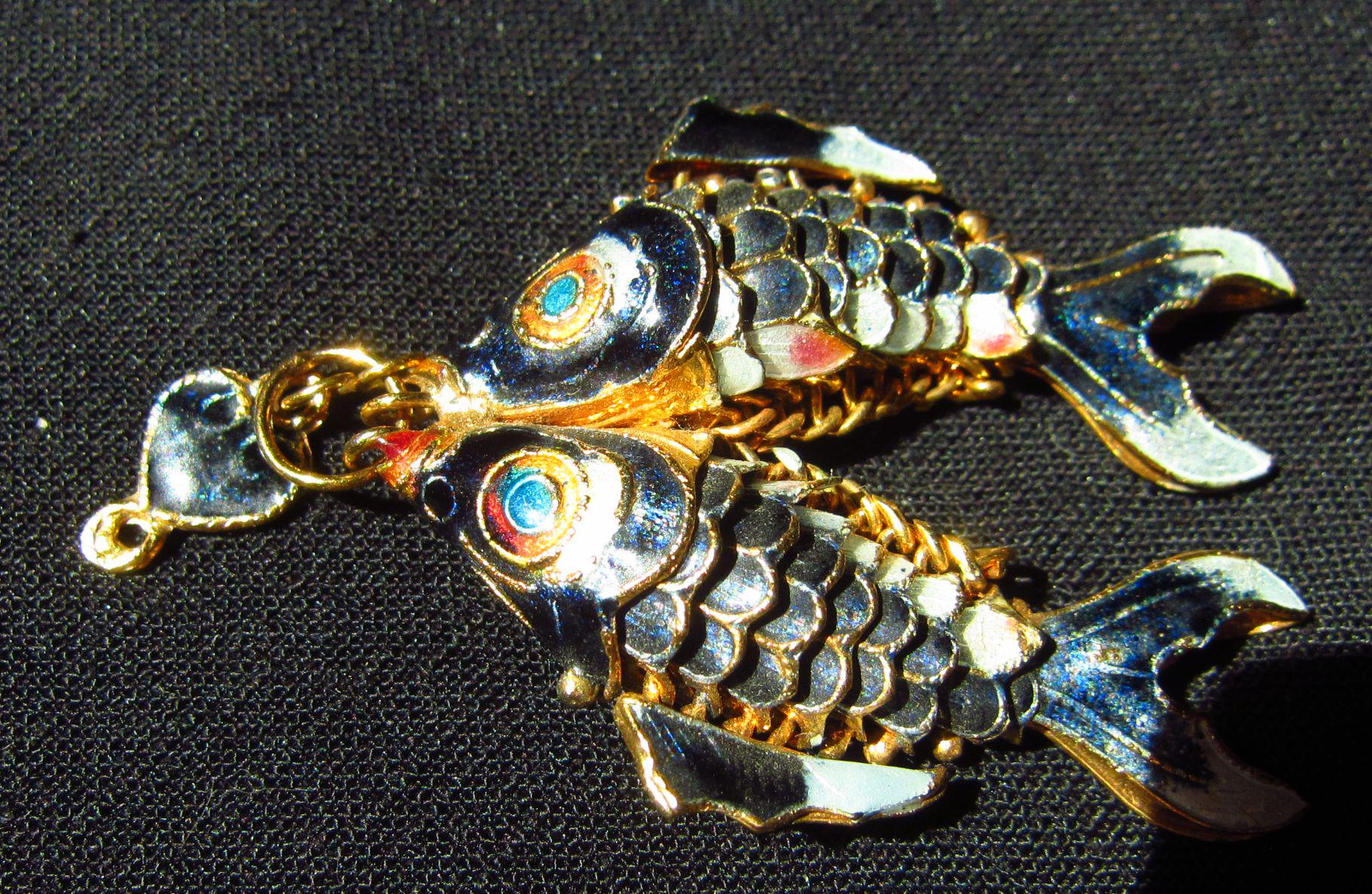 Probably dating from the 1950’s or 60’s. This pendant is of a pair of matching Koi on a short leader chain with a 24” gold tone chain. They are predominately blue, with other shades of white and amber plus the bright brass color of edges of the scales and fins. The chain is gold tone metal with nicely machined links. Excellent vintage quality and condition. Articulation is smooth and fluid. Latch works great. Ready to wear. See the photos for a more complete description.