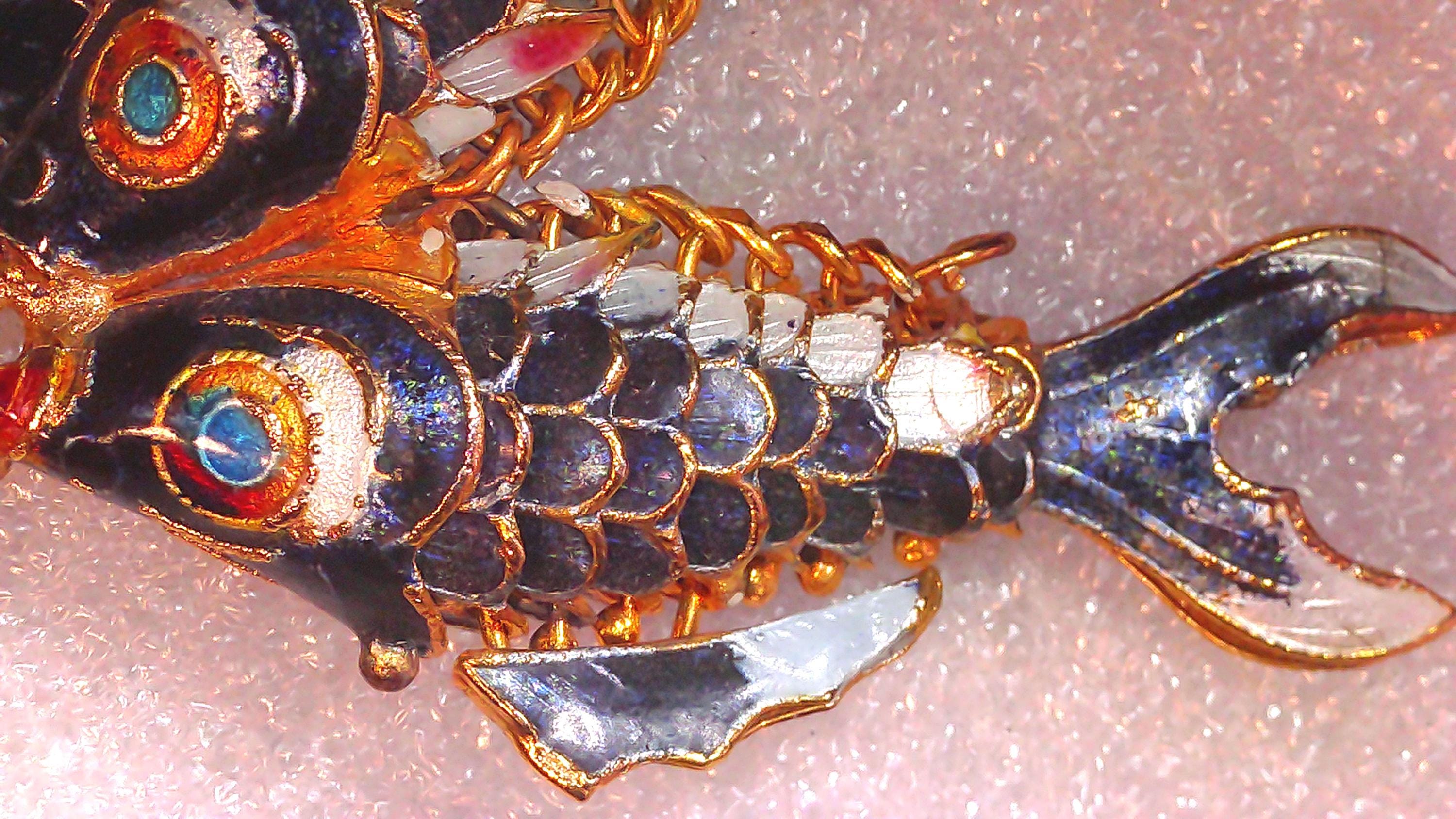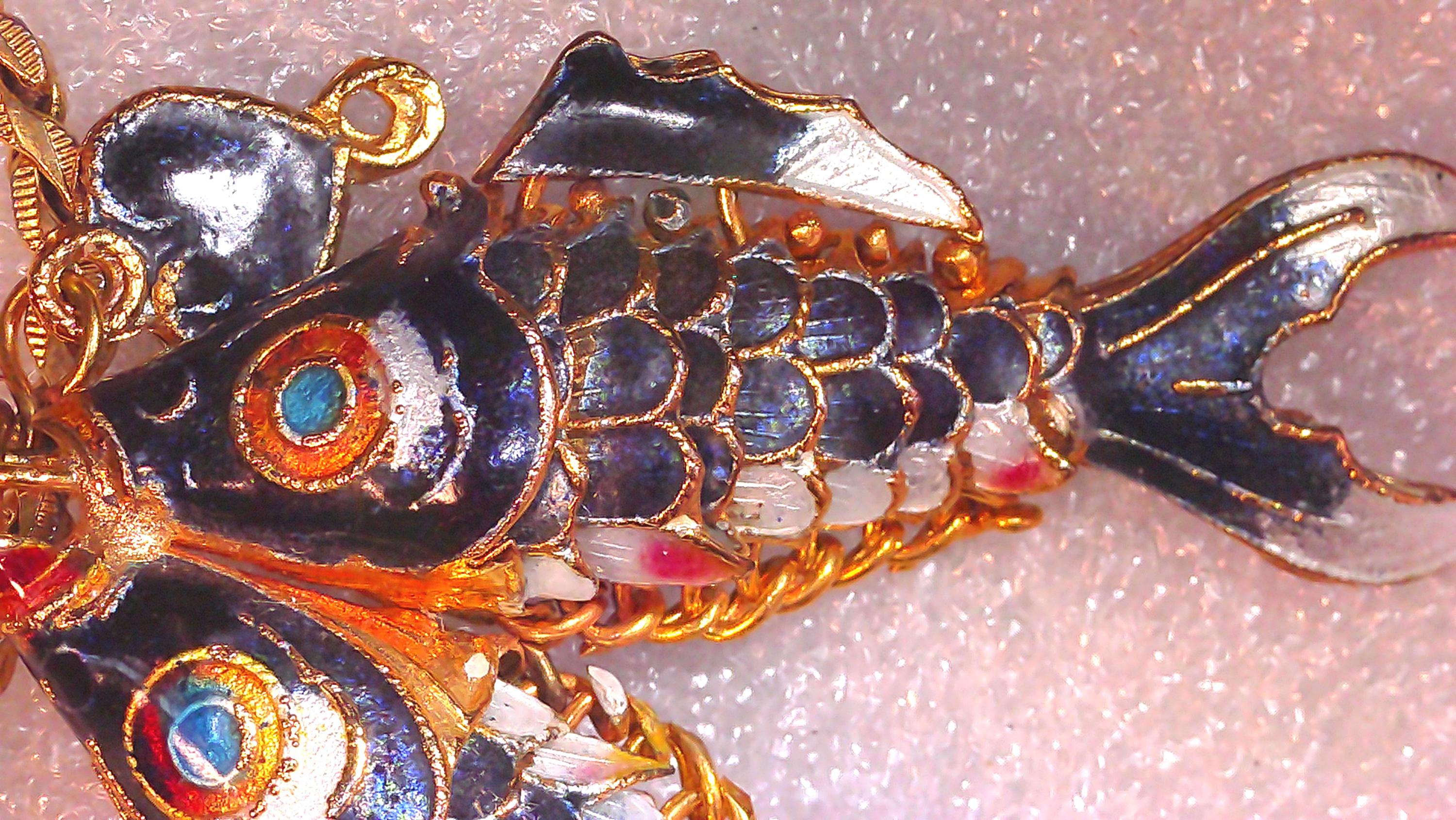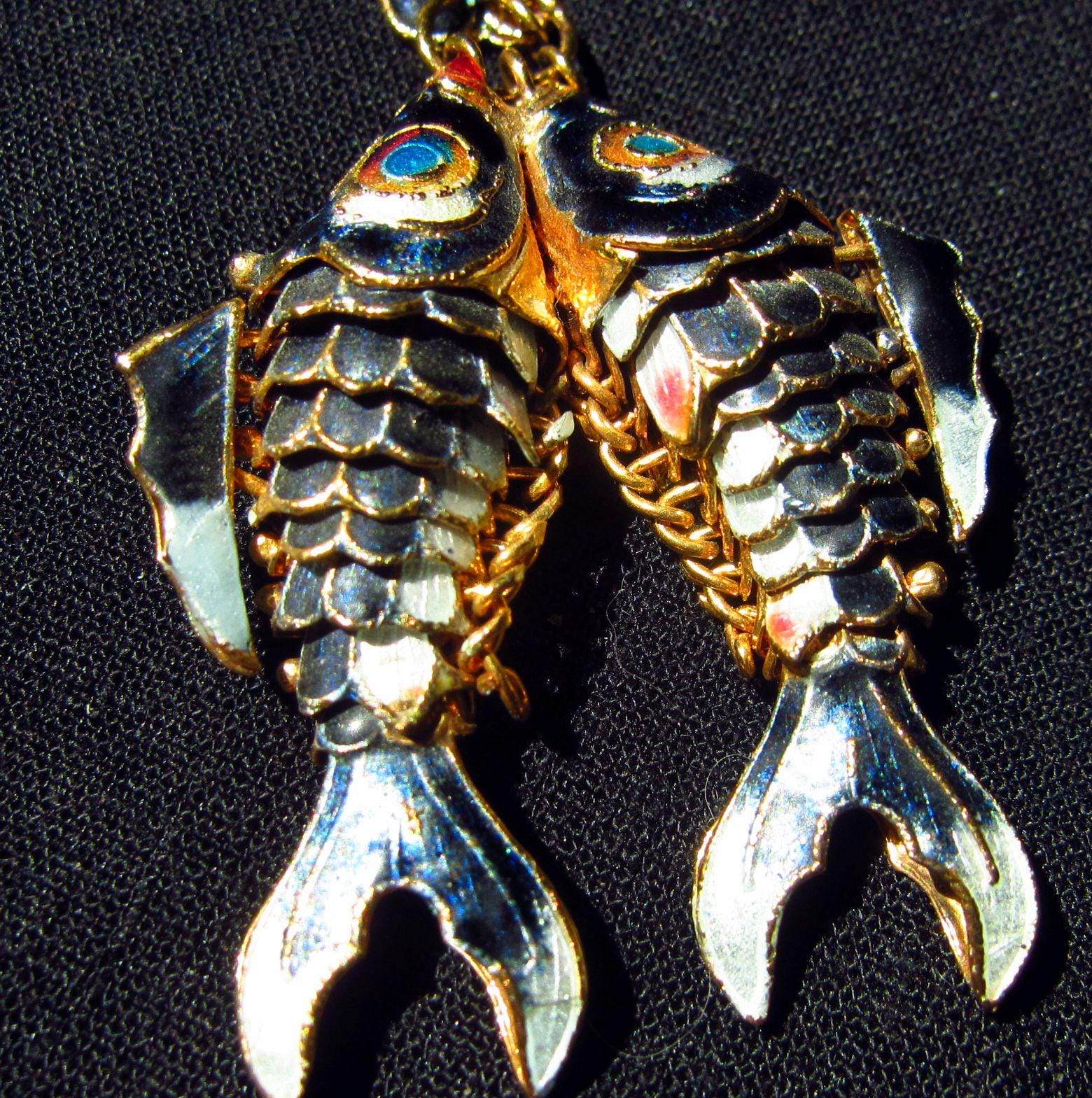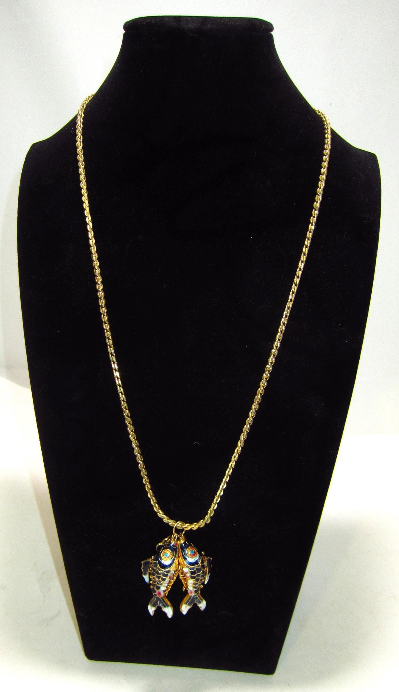 Probably dating from the 1950’s or 60’s. This pendant is of a pair of matching Koi on a short leader chain with a 24” gold tone chain. They are predominately blue, with other shades of white and amber plus the bright brass color of edges of the scales and fins. The chain is gold tone metal with nicely machined links. Excellent vintage quality and condition. Articulation is smooth and fluid. Latch works great. Ready to wear. See the photos for a more complete description.