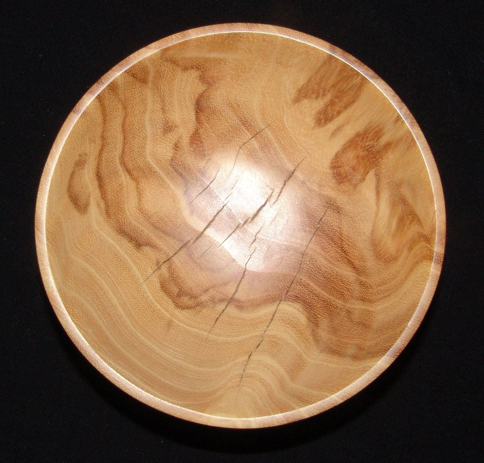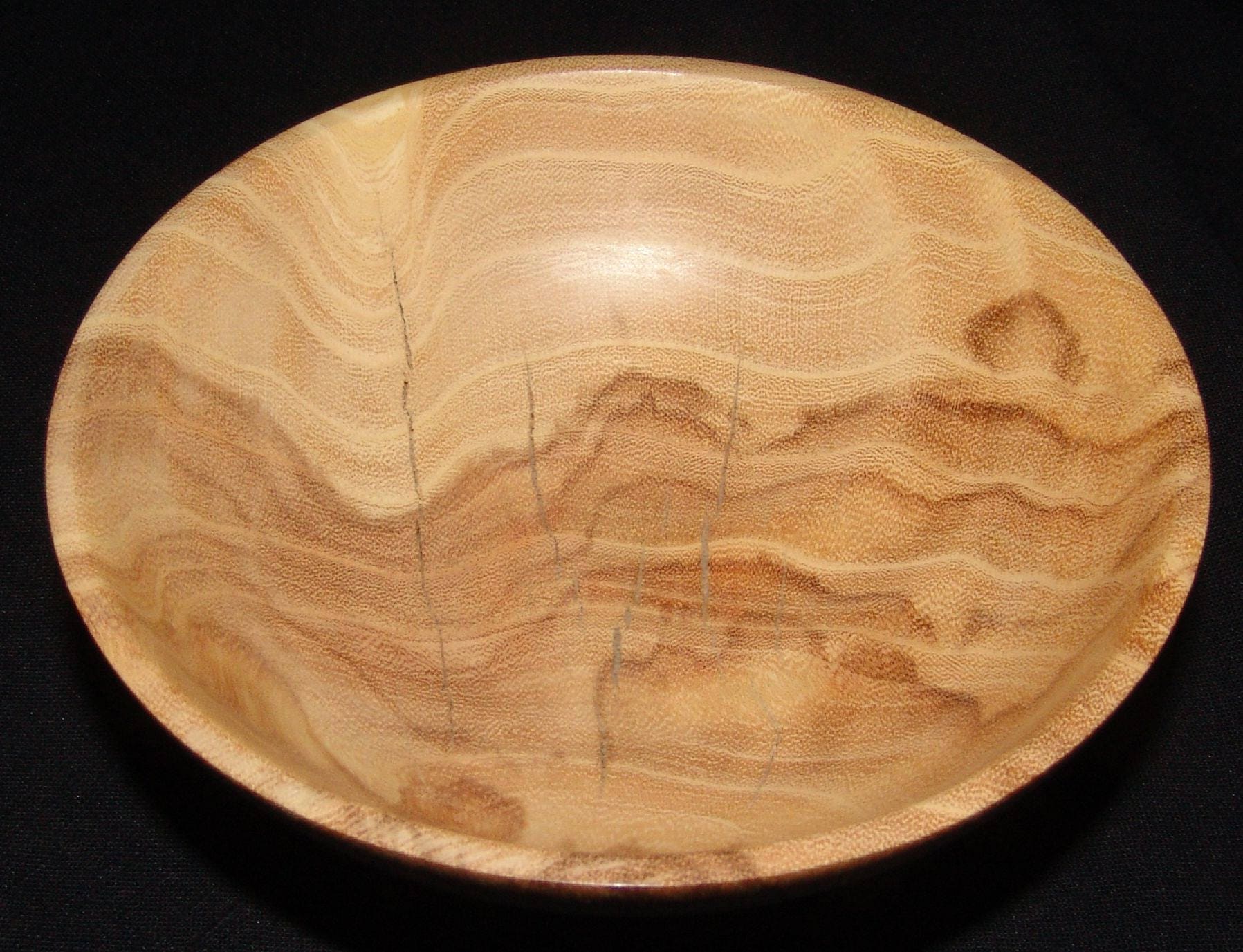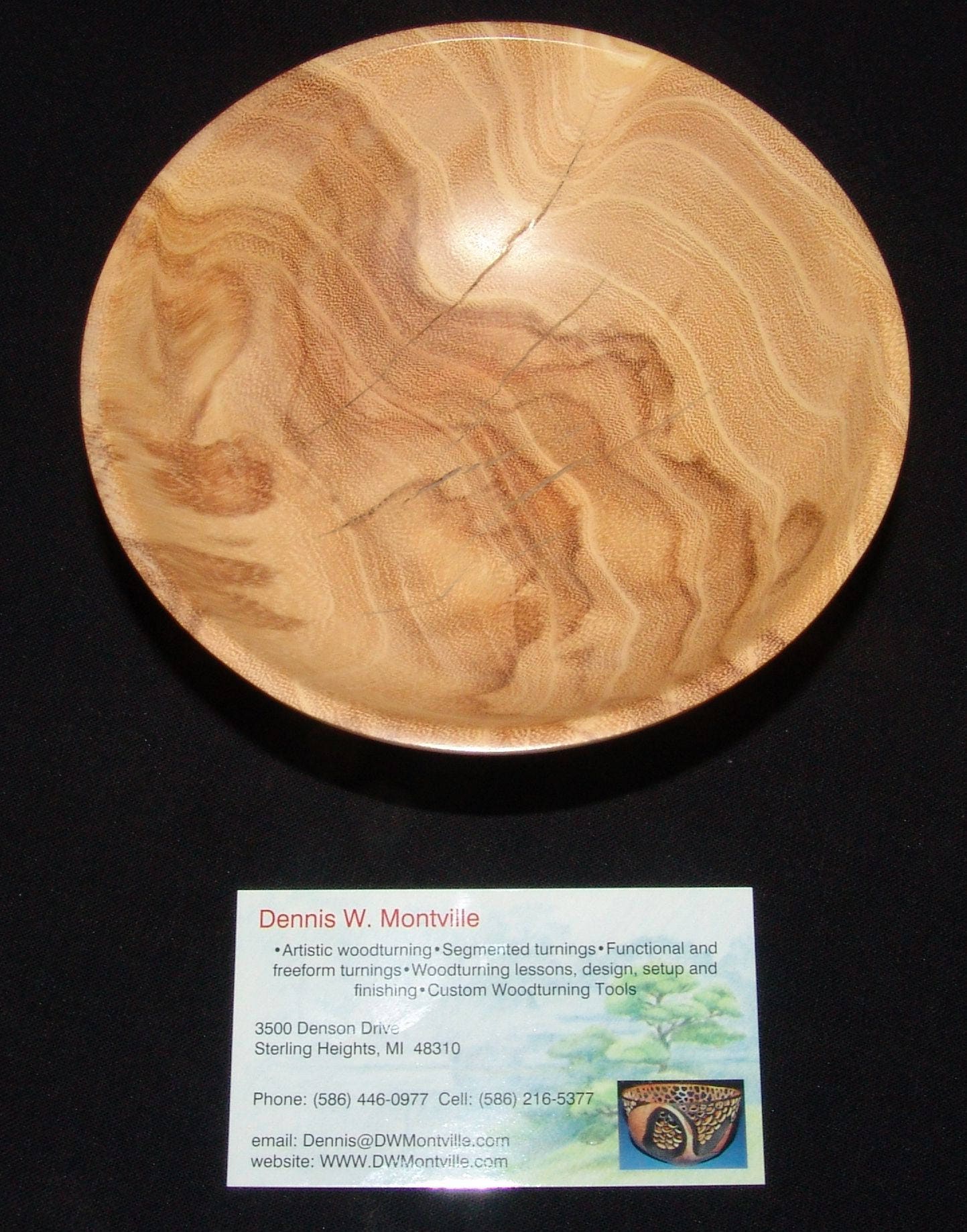 The bowl has a nice semi-gloss finish on it to minimize shine and allow the wood to show the grain and natural mineral staining. I show it in one of the photos with one of my business cards to better let you judge the scale of this piece.