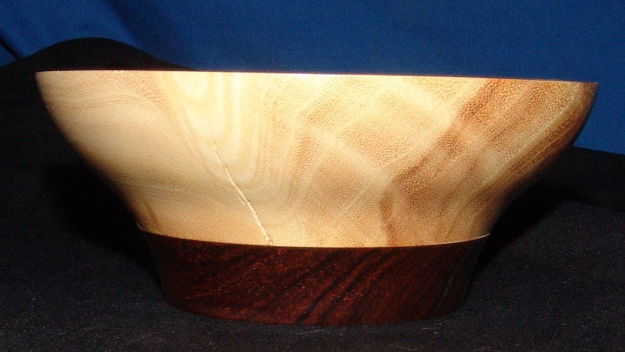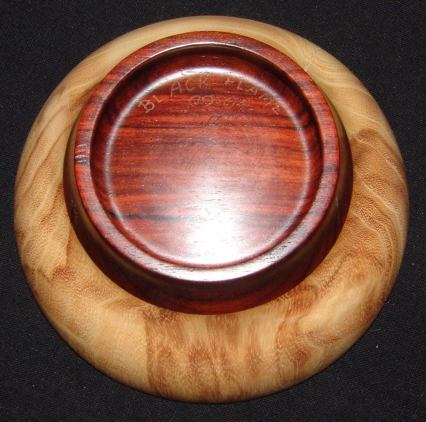 This bowl measures only 5” in diameter and 2” tall, but it packs a lot of character in that space. It is made of black locust with flamewood as the foot. It is a nice simple shape, with very strong grain structure on the black locust. As you can see, the black locust has cross-grain cracking at the bottom. That occurred early since the wood was not yet completely cured. It is stable now and will stay as you see it. I think it adds interesting detail myself. You can decide yourself if you want to invite this into your home.
