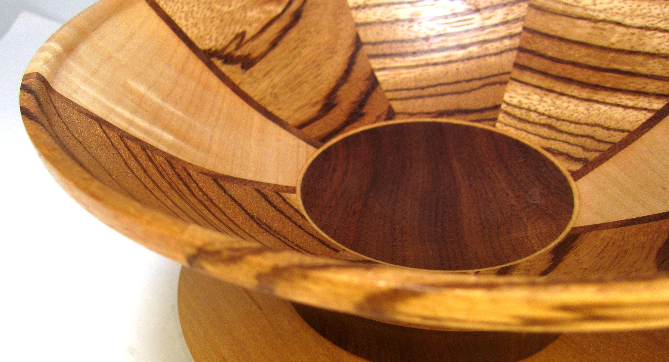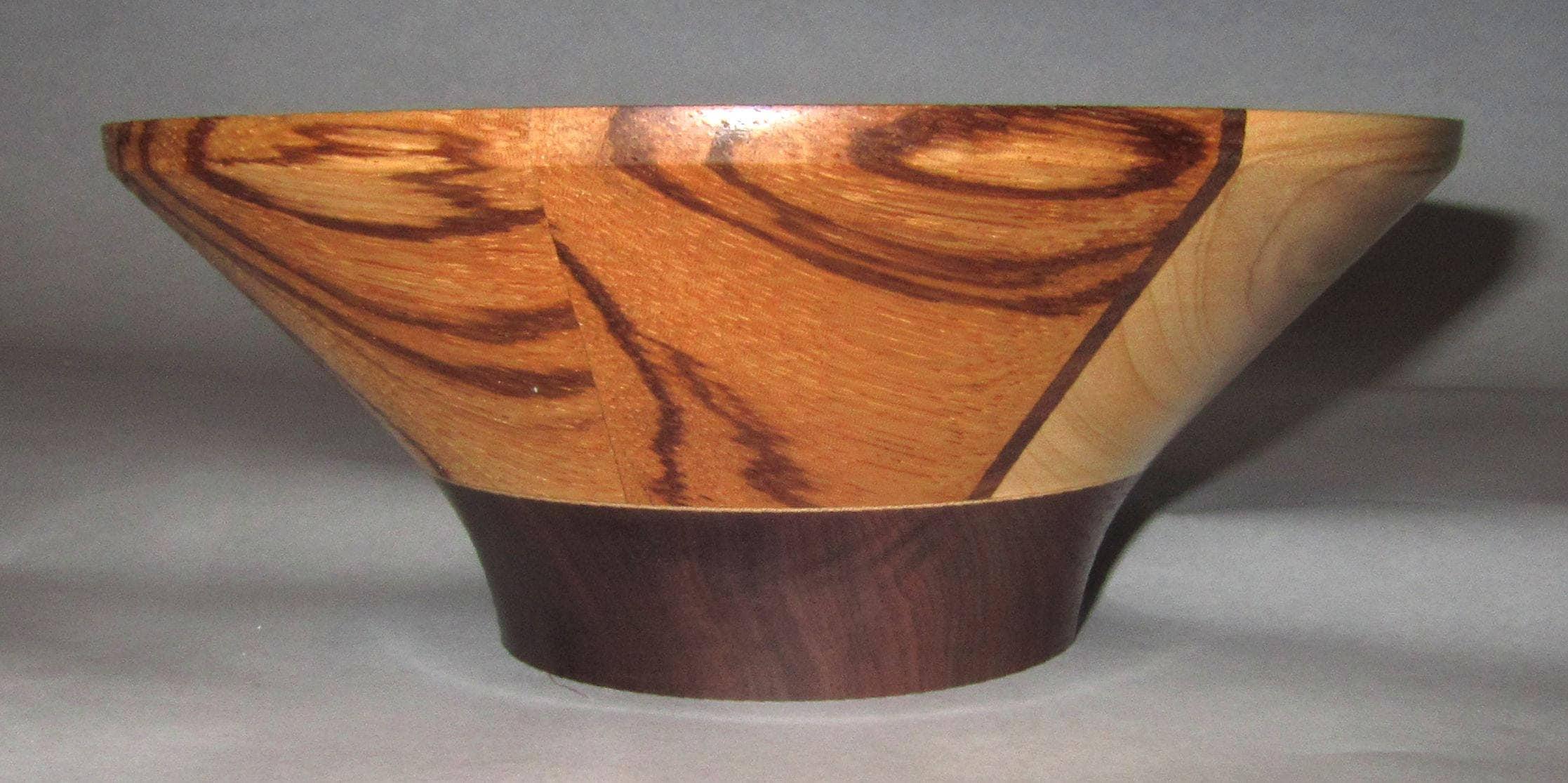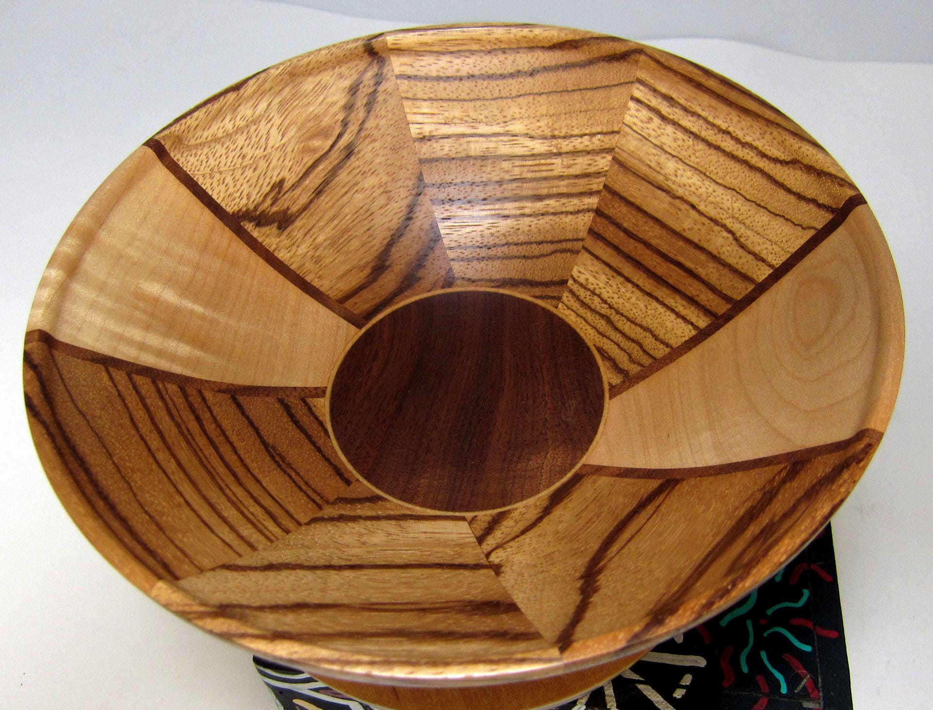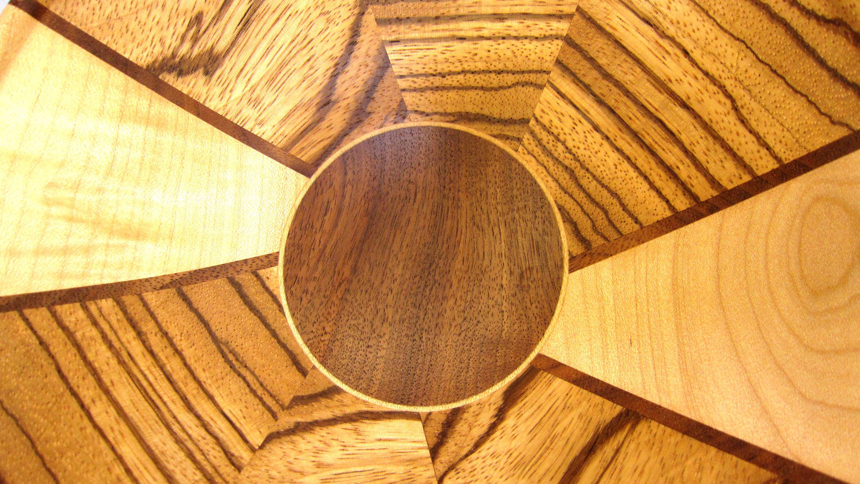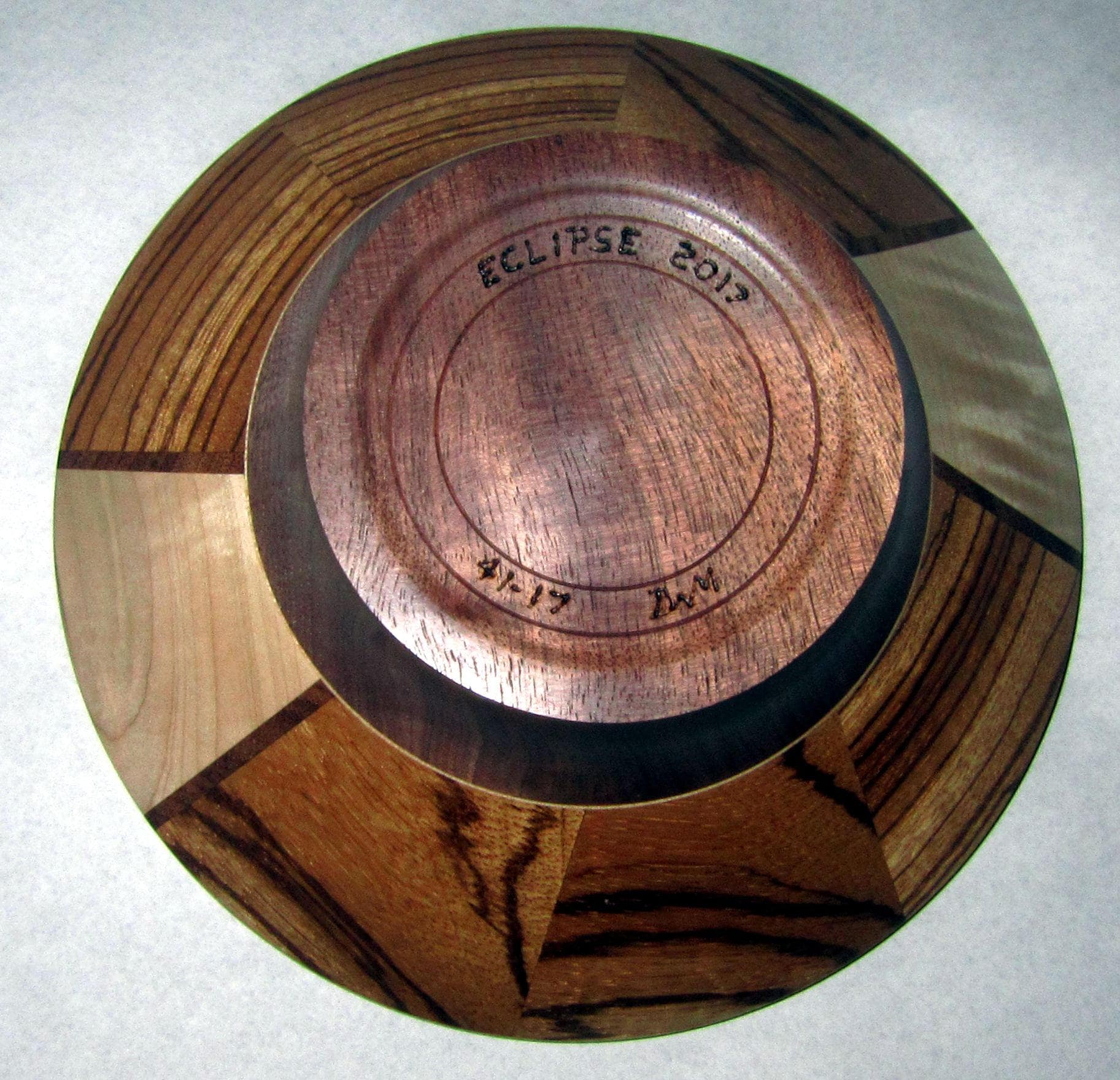 “Eclipse 2017” is a segmented bowl using Zebrawood and Maple in a pinwheel design with a Black Walnut base. It was turned on the day of the eclipse of 2017, and the two pieces of maple represent the jets of the corona during the eclipse. It measures about 7 ½ inches around and 3 inches high. It has a semi-gloss finish. Care is simply to dust it off occasionally. Not meant to hold food.