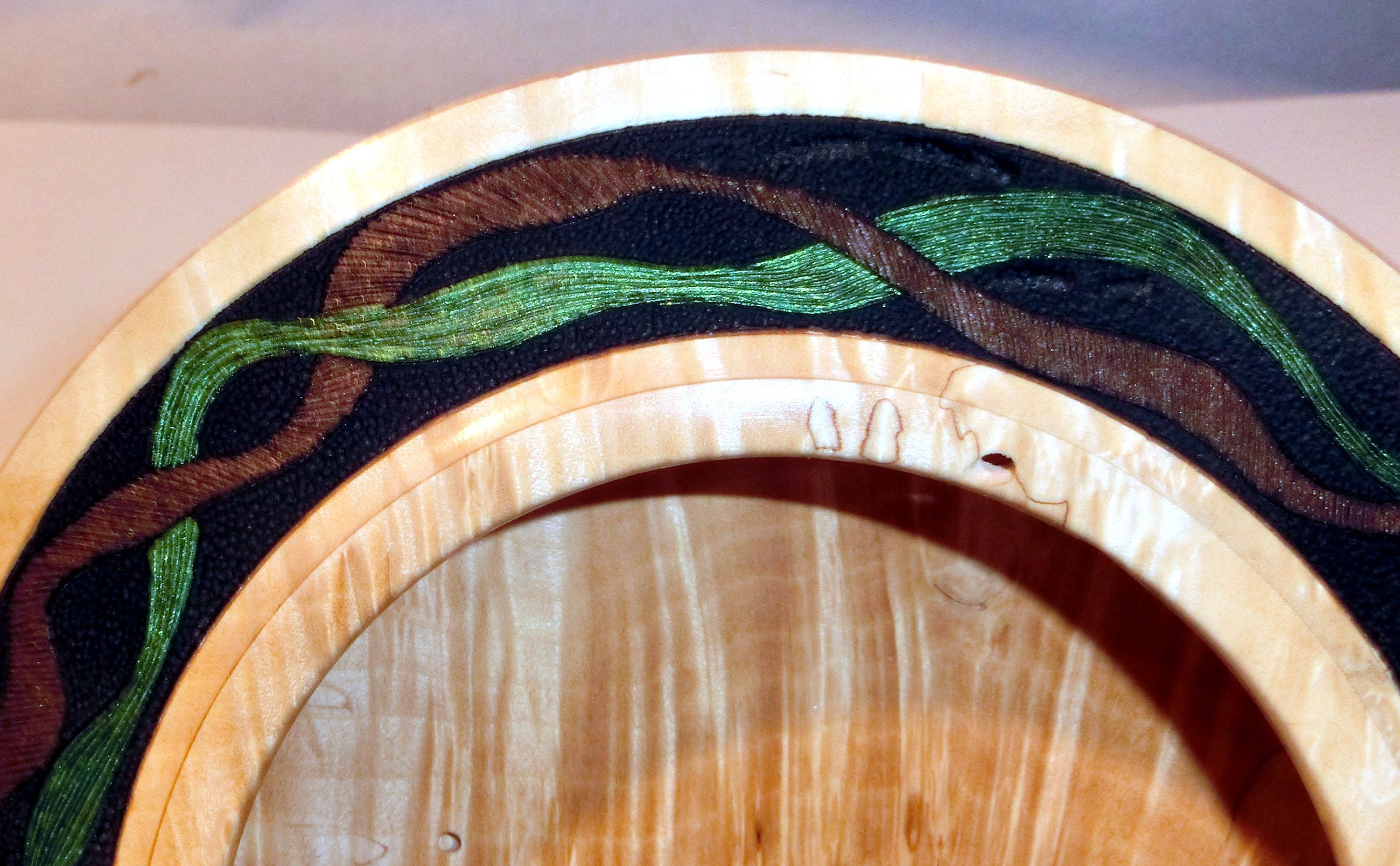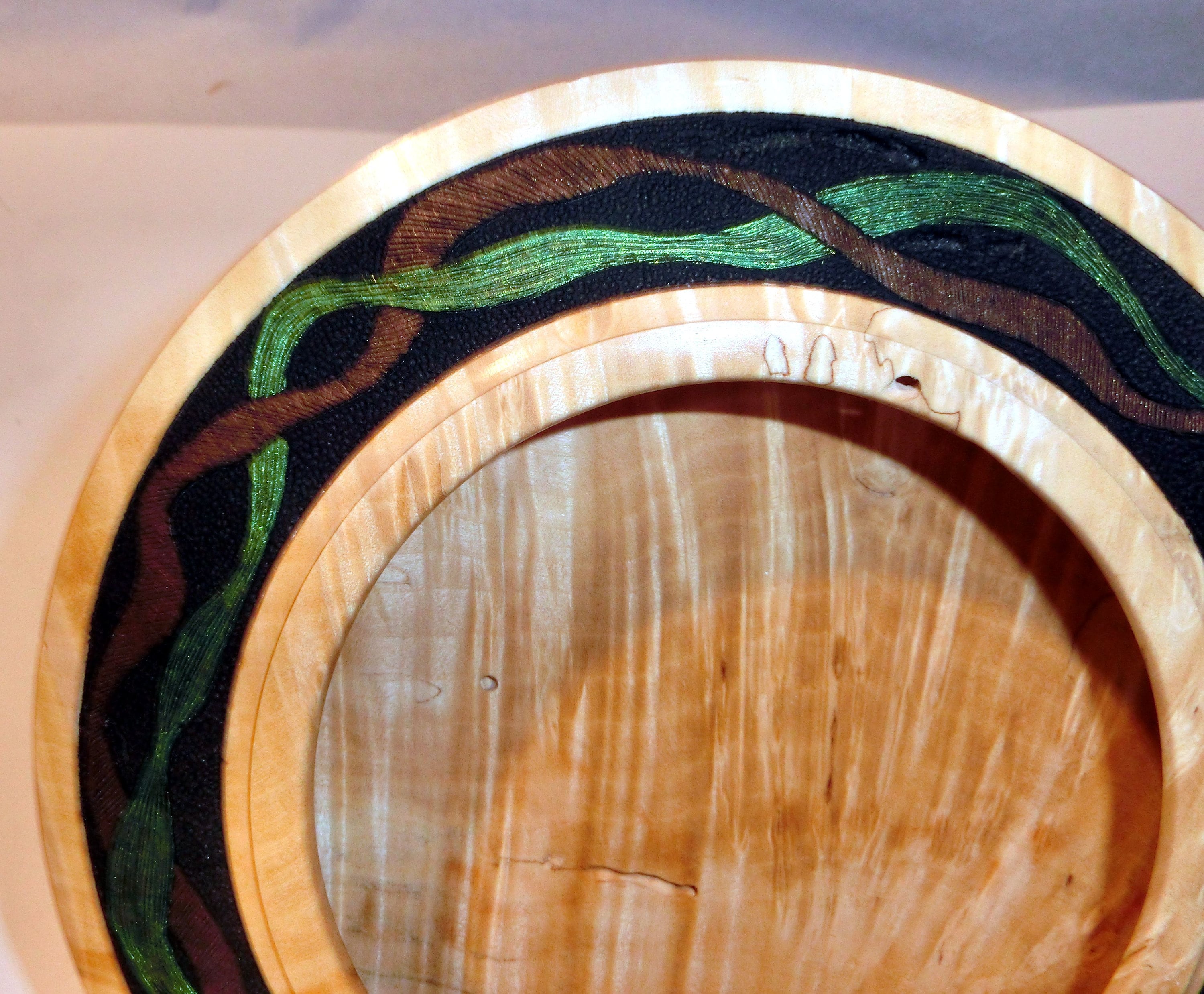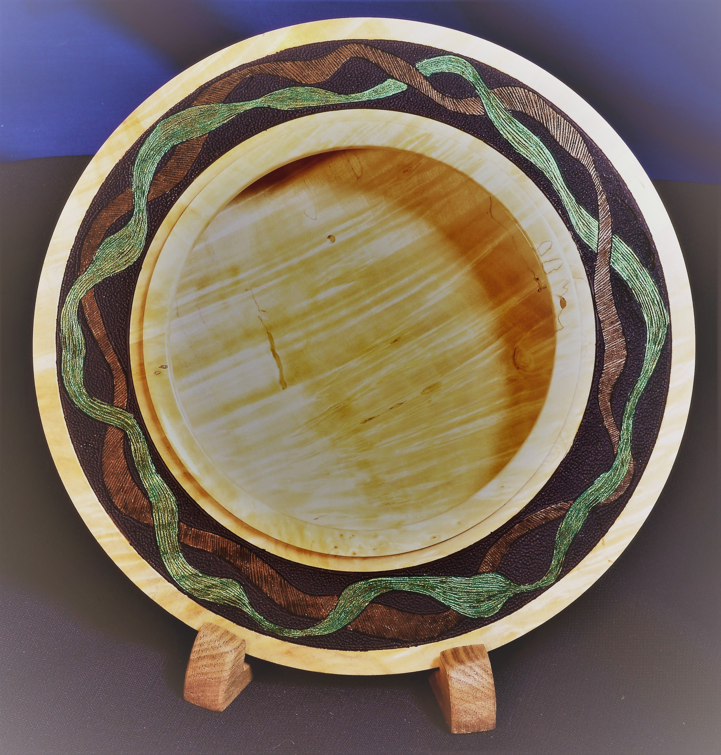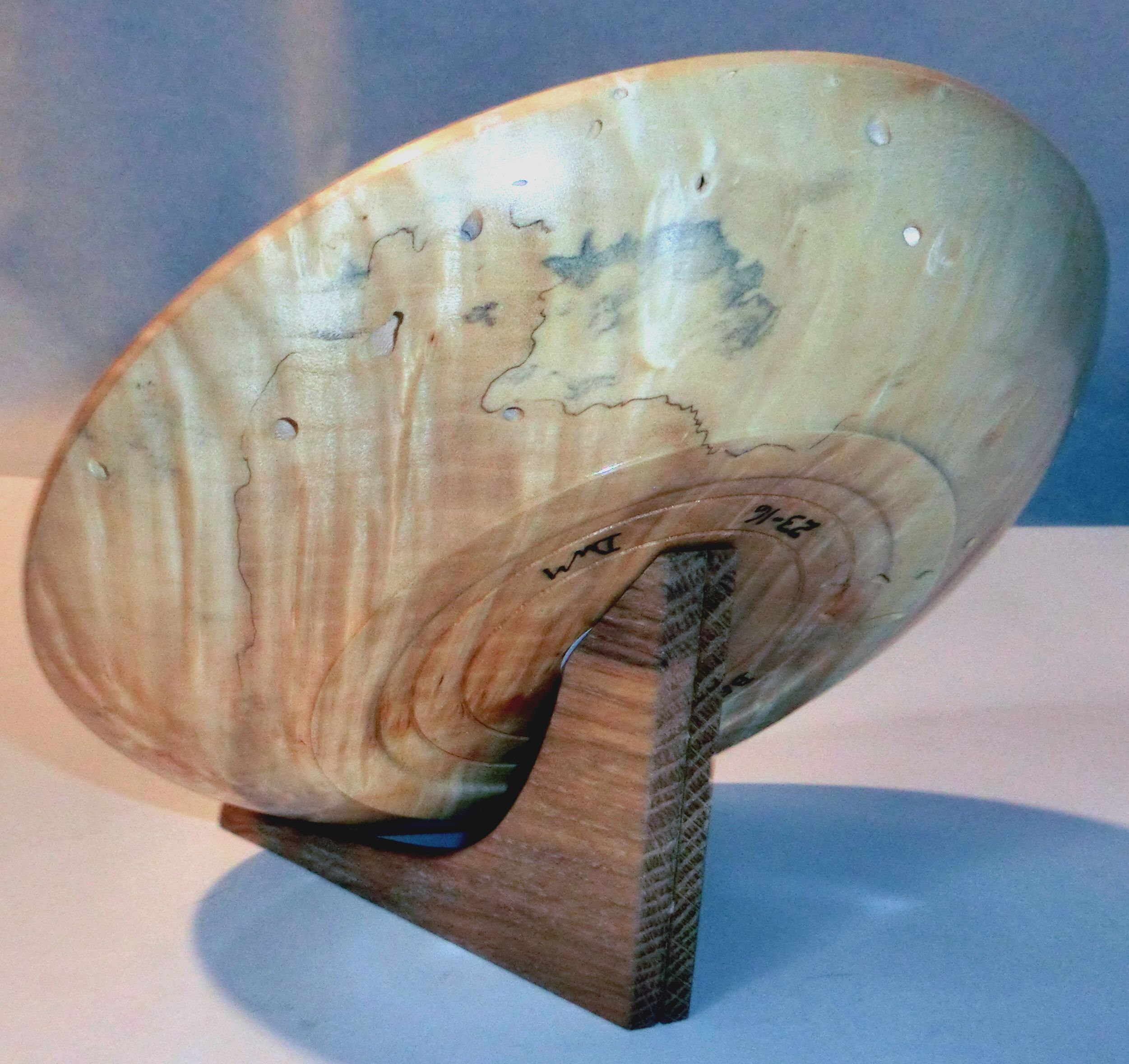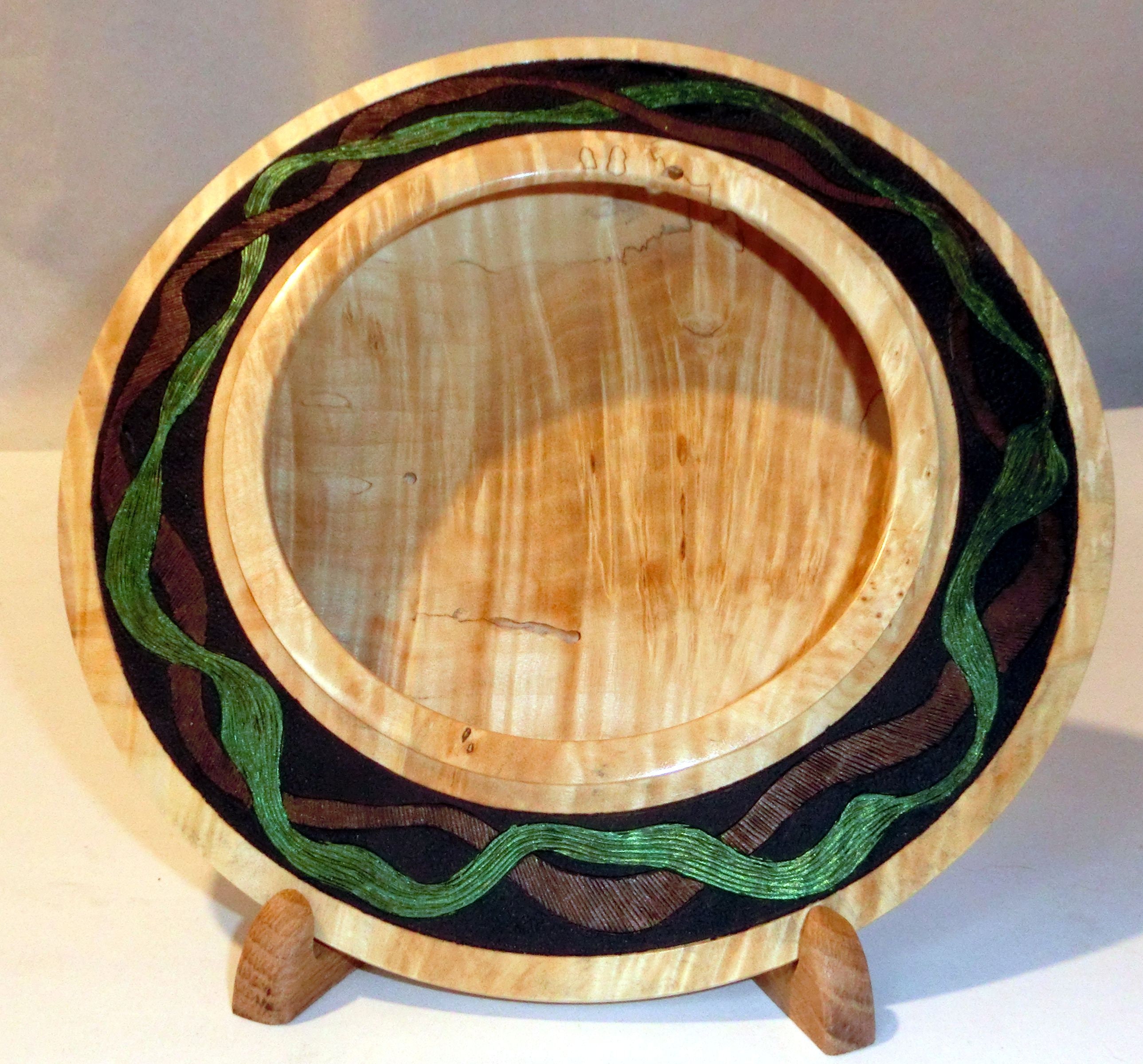 “Best of Times” measures 7 inches in diameter and 1 ½ inches tall. It is difficult to categorize the form, since it is hollow but is more like a plate. The inside continues under the rim resulting in a very light and delicarte piece. The rim is decorated with pyrography for texture and acrylic paint for the color. The opening is just under 4 inches. The display stand holds it at about a 45 degree angle, so it will present nicely on any shelf or table.