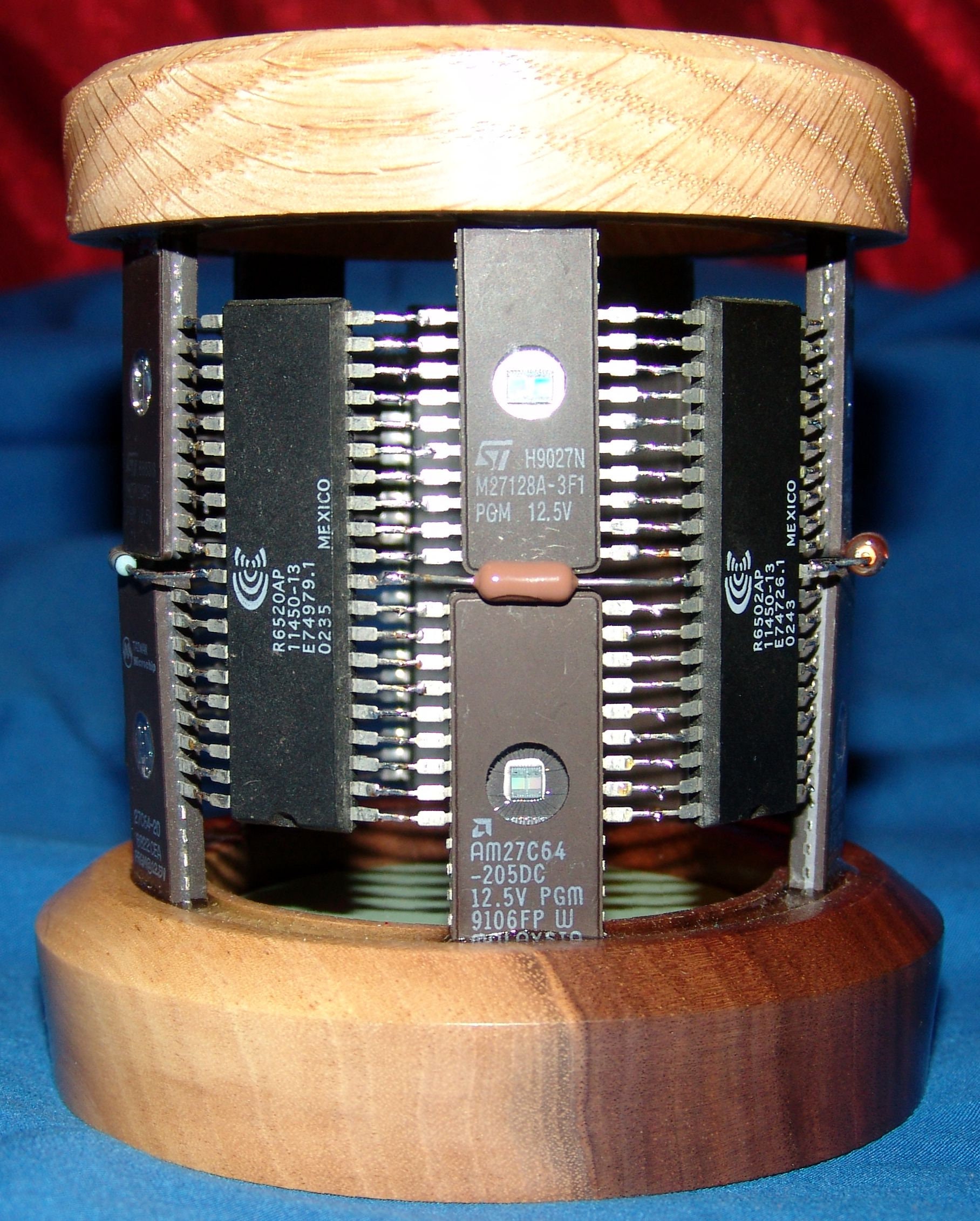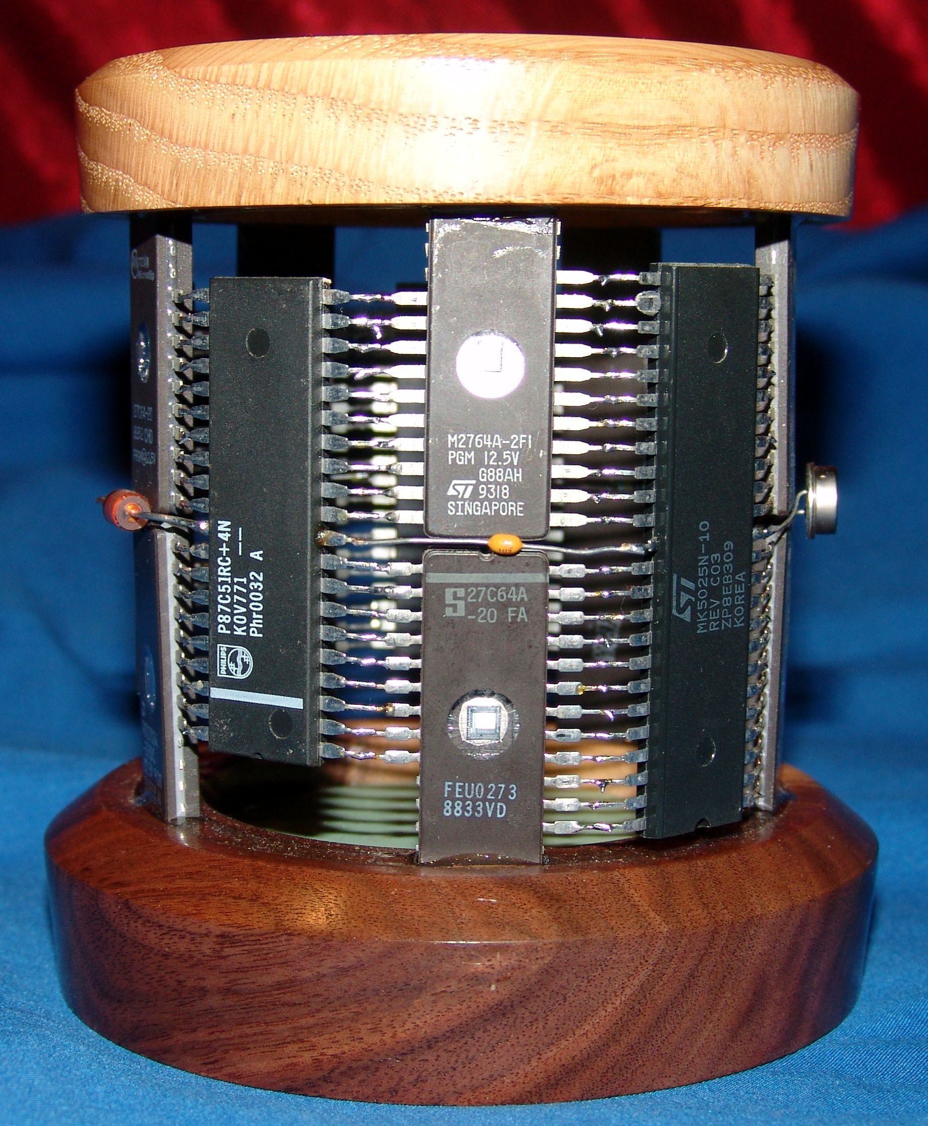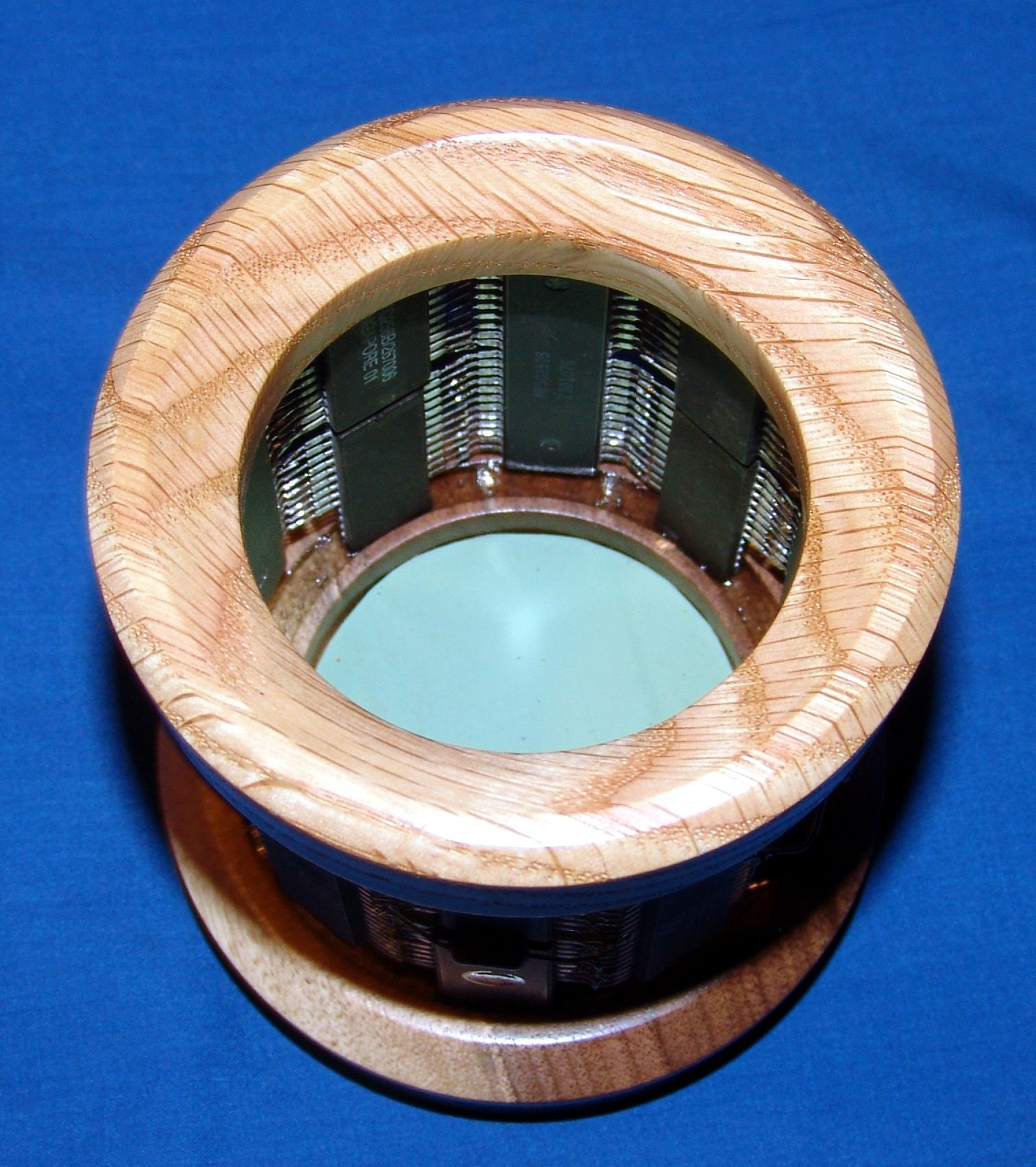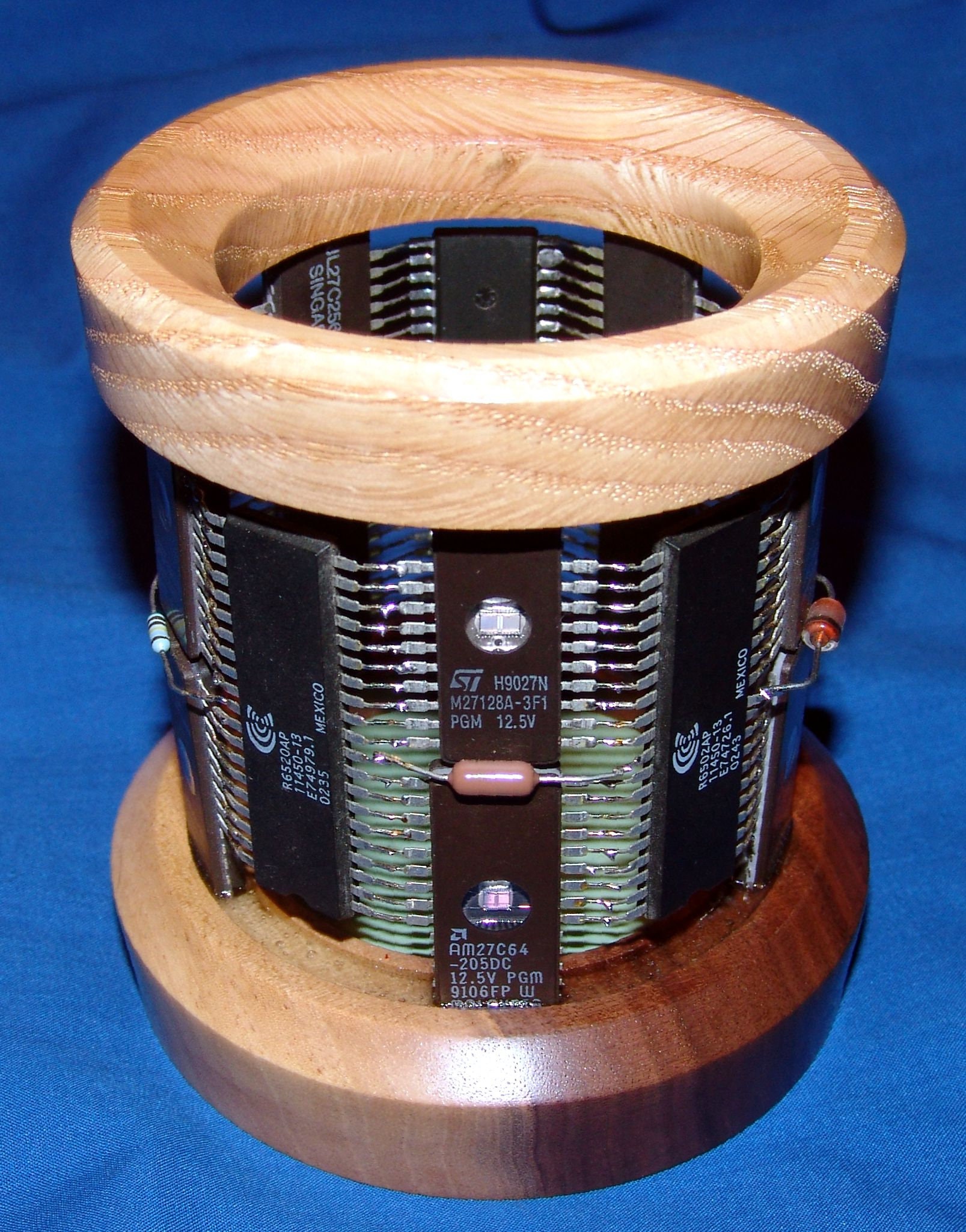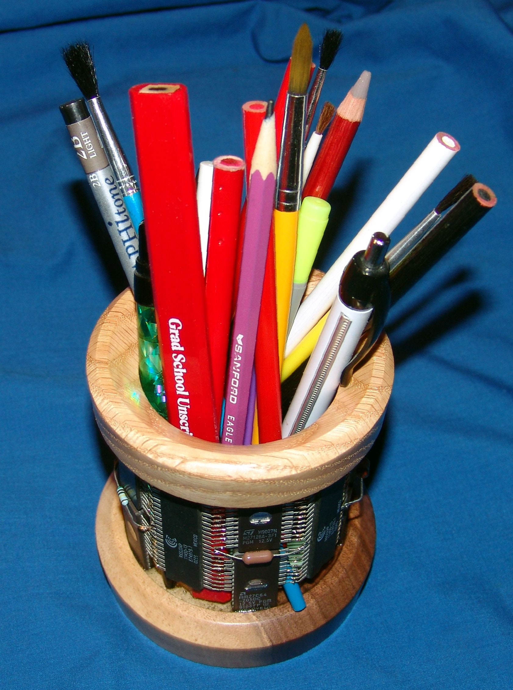 This pencil holder uses integrated circuit chips and other electronic components as construction materials. It measures about 4 inches around at the base and is about 4 ½ inches tall. The opening at the top is about 2 ¼ inches. The top and bottom pieces are of oak and black walnut and the chips are mounted using industrial epoxy. This one has a variety of integrated circuit chips and other electronic components. I also put a piece of vinyl on the bottom of the inside to protect the items you put inside from damage rather than have them hit the hard wood.